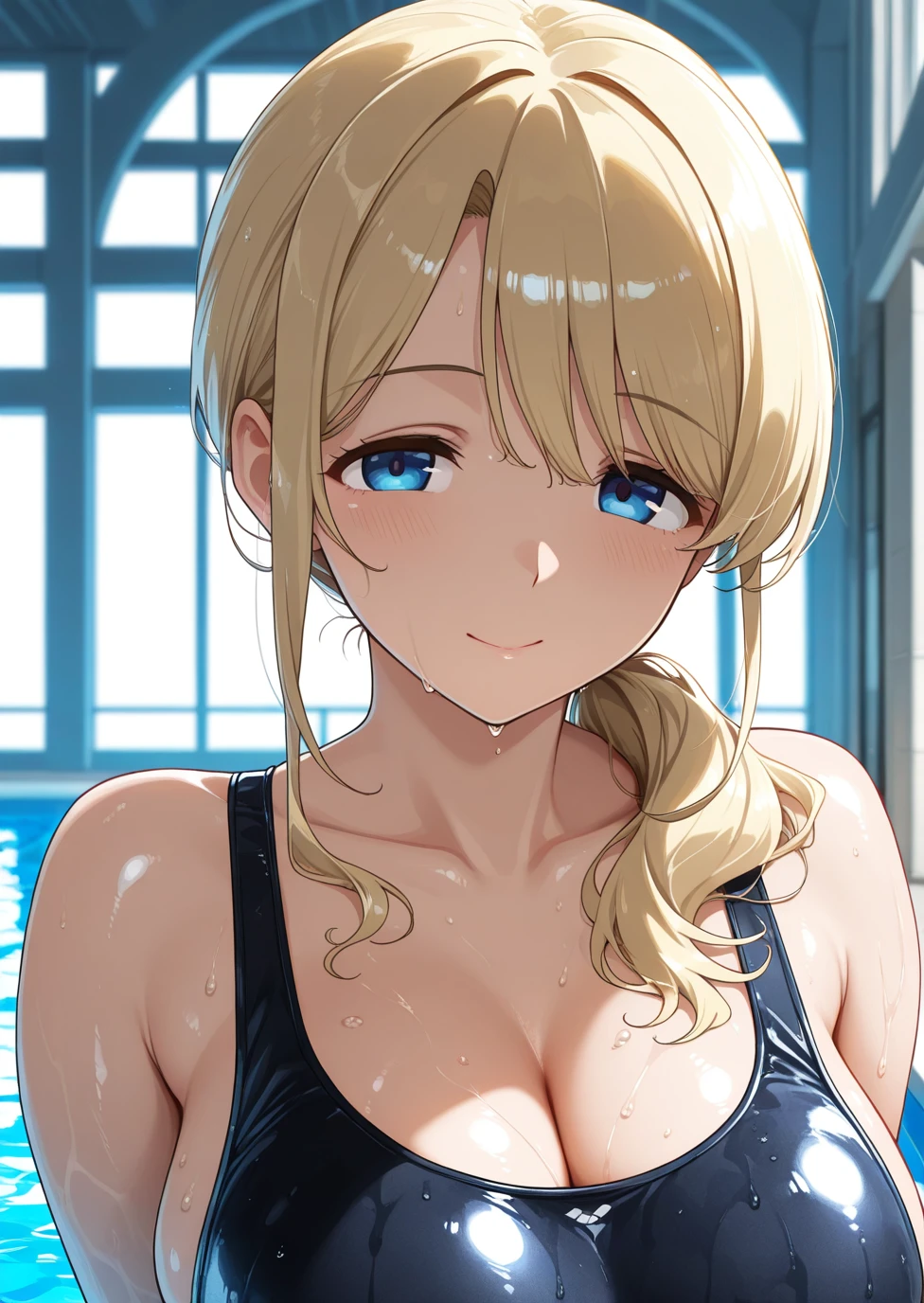 n0z0k1w4n4_0b4s4n,1girl,blue_eyes,short_ponytail, blonde_hair,hair over left shoulder,black one-piece swimsuit,milf,large_breasts, [[narrowed_eyes]], tareme