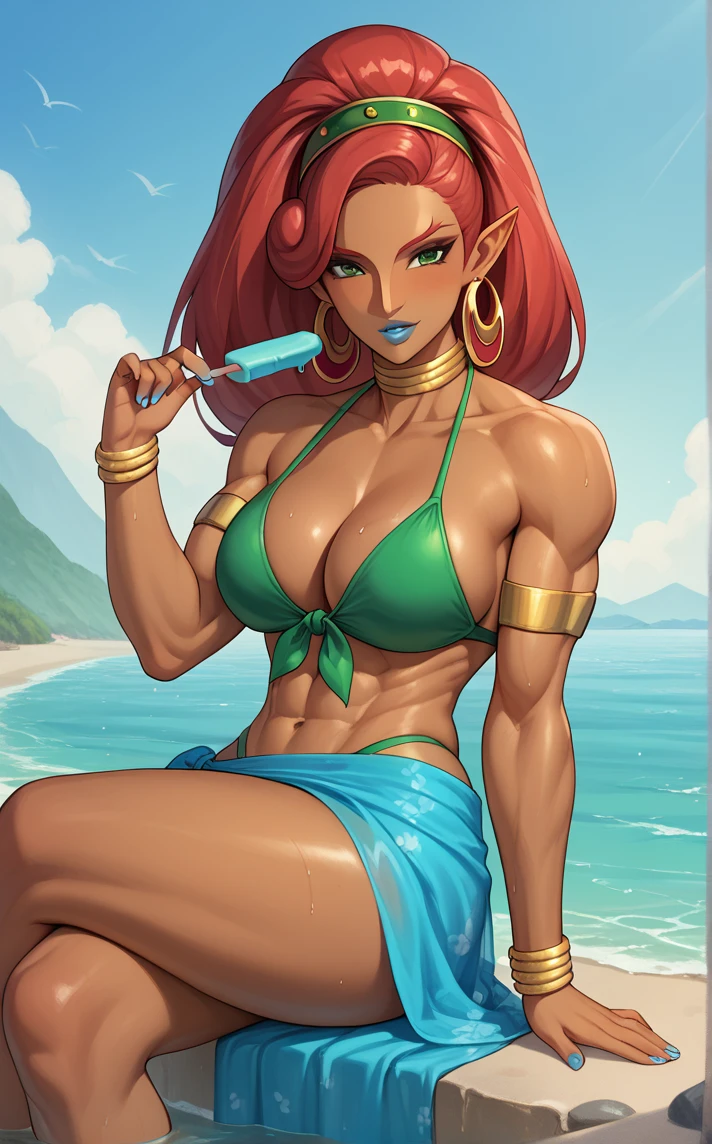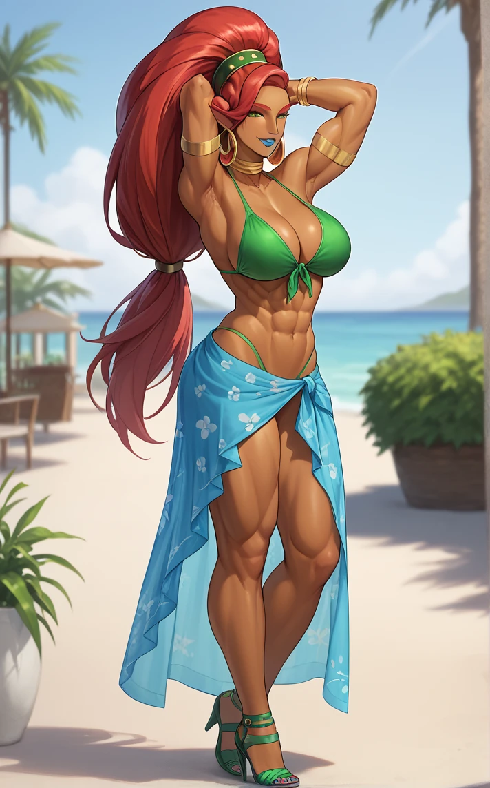 RedBikini_Urbosa_ownwaifu, 1girl, bare shoulders, big hair, blue lips, blue nails, circlet, collarbone, dark-skinned female, green eyes, hair pulled back, halterneck, hoop earrings, jewelry, lipstick, long nose, makeup, muscular female, nail polish, neck ring, pointy ears, pointy nose, red hair, tall female, thick eyebrows, toned, urbosa, very dark skin, abs, biceps, bracelet, cleavage, criss-cross halter, large breasts, navel, obliques, high ponytail, ponytail, veins, sarong, green sarong, red swimsuit, thick thighs,