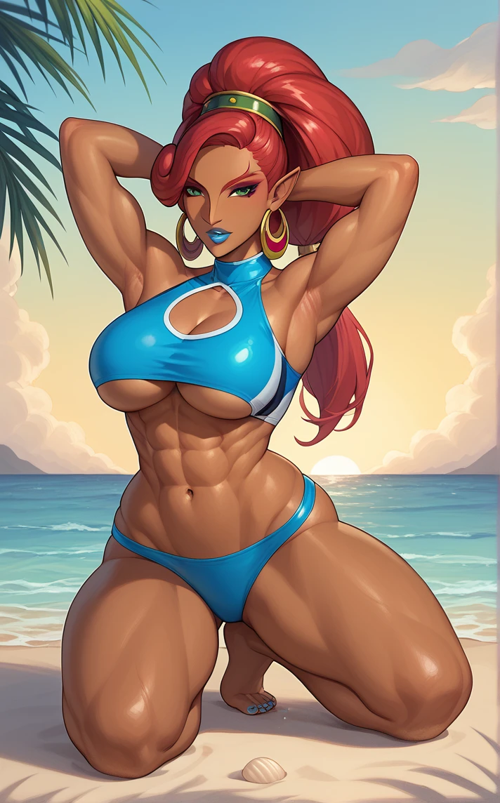 BlueSwimsuit_Urbosa_ownwaifu, 1girl, big hair, blue lips, collarbone, dark-skinned female, green eyes, hair pulled back, hairband, high ponytail, hoop earrings, jewelry, lipstick, makeup, pointy ears, pointy nose, red hair, tall female, thick eyebrows, toned, urbosa, very dark skin, abs, blue bikini, cleavage cutout, clothing cutout, eyeshadow, large breasts, muscular female, navel, swept bangs, swimsuit, tankini, underboob, bare shoulders, blue nails, crop top, midriff, nail polish, obliques, thick thighs, wide hips,