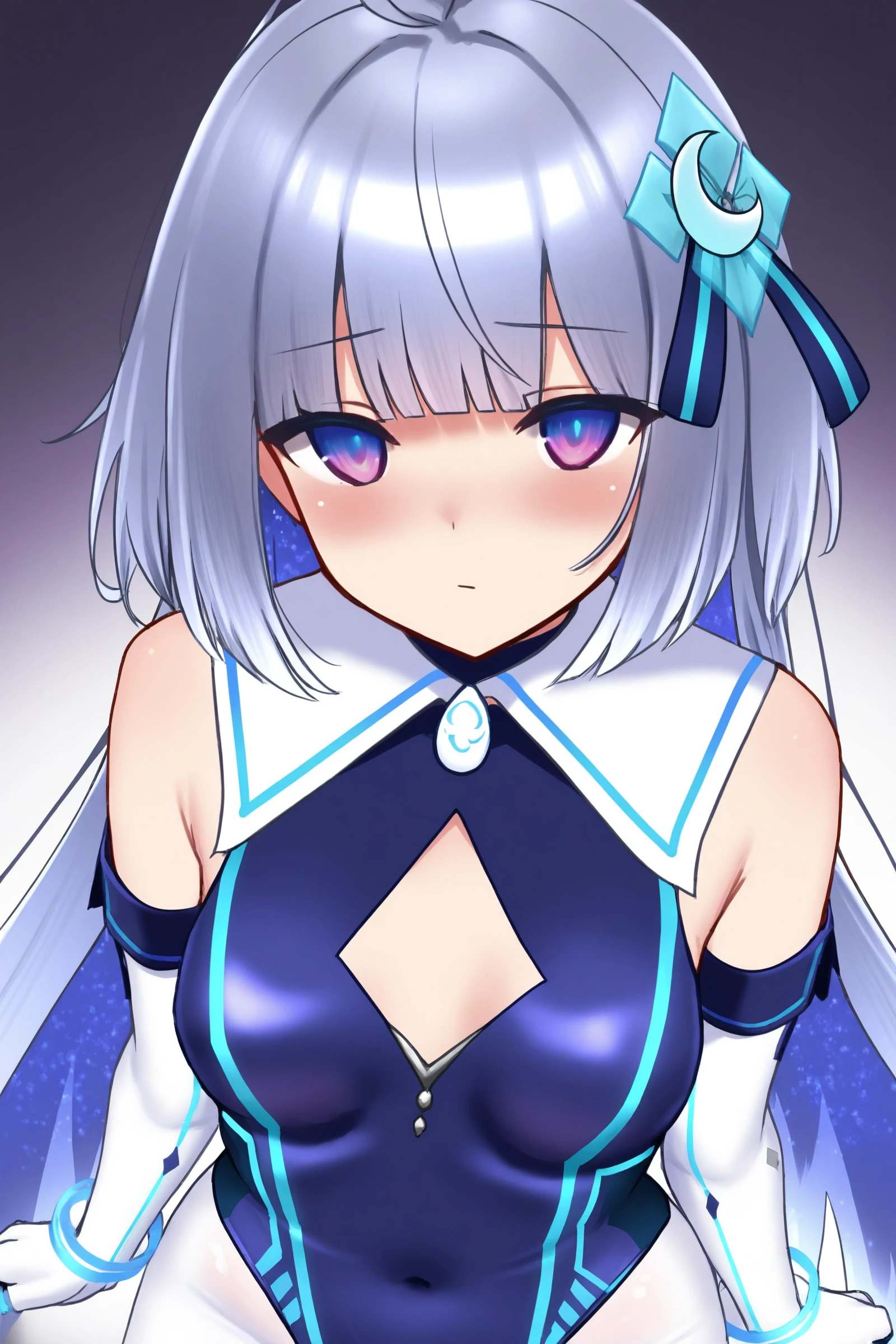 selenoxia, 1girl, grey hair, starry inner hair, very long hair, blunt bangs, ahoge, hair ribbon, medium breasts,crescent rhombus hair ornament,multicolored eyes, purple eyes, blue eyes变身服
