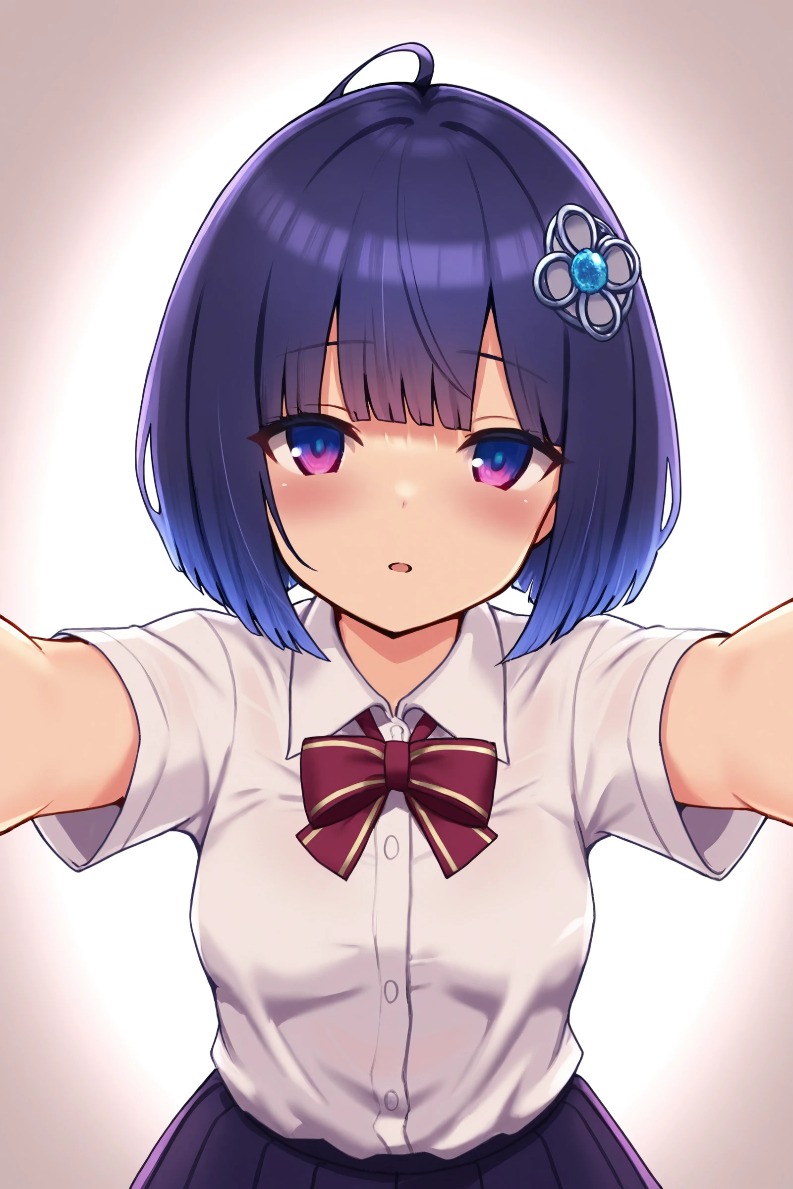 sayozuki, 1girl, ahoge, dark purple hair, dark blue hair, short hair, bob cut, ??????????????, blunt bangs,single silver flower hair ornament,multicolored eyes, purple eyes, blue eyes,校服 school uniform