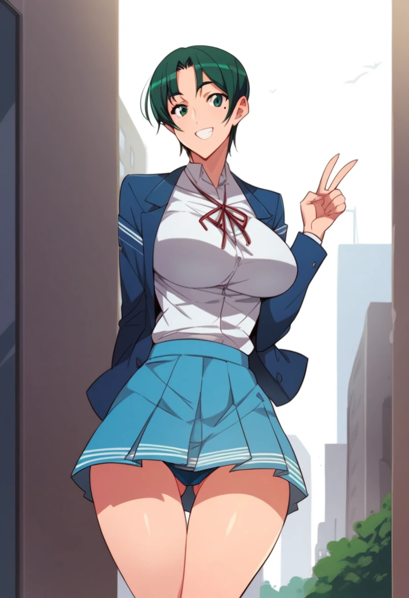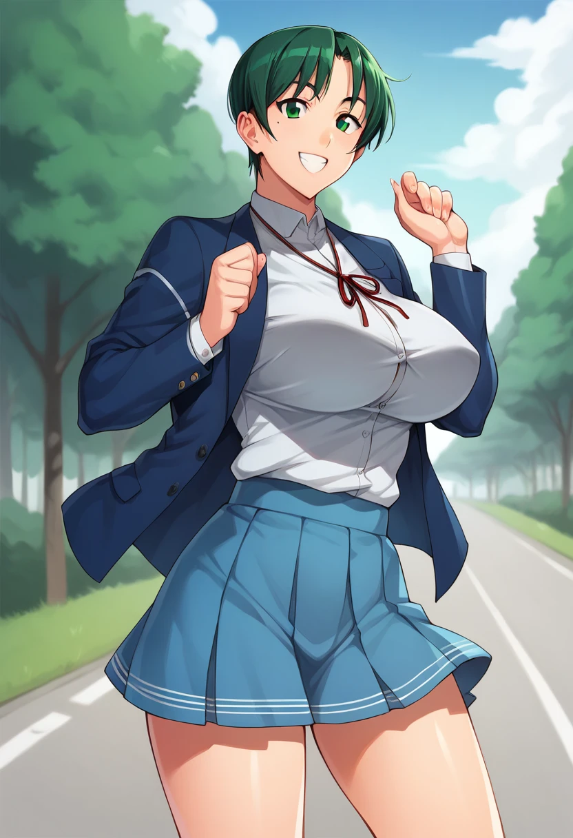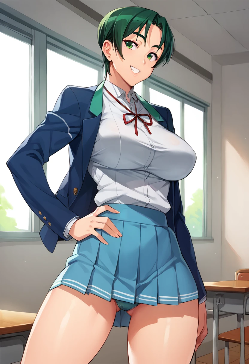 momokino, large breasts, short hair, green hair, mole, school uniform, skirt