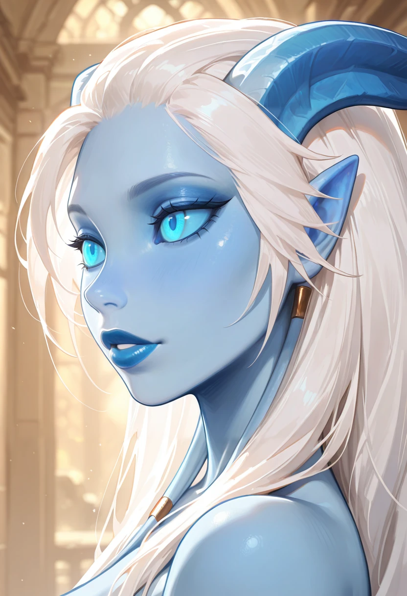 Support tags : colored skin, blue skin, blue sclera, blue eyes, blue lips, blue tongue, white hair, long hair, horns, pointy ears, large breasts, pierced nipples, nipples, nipple piercings, hooves, tail, tail ring, tail ornament, hooves,