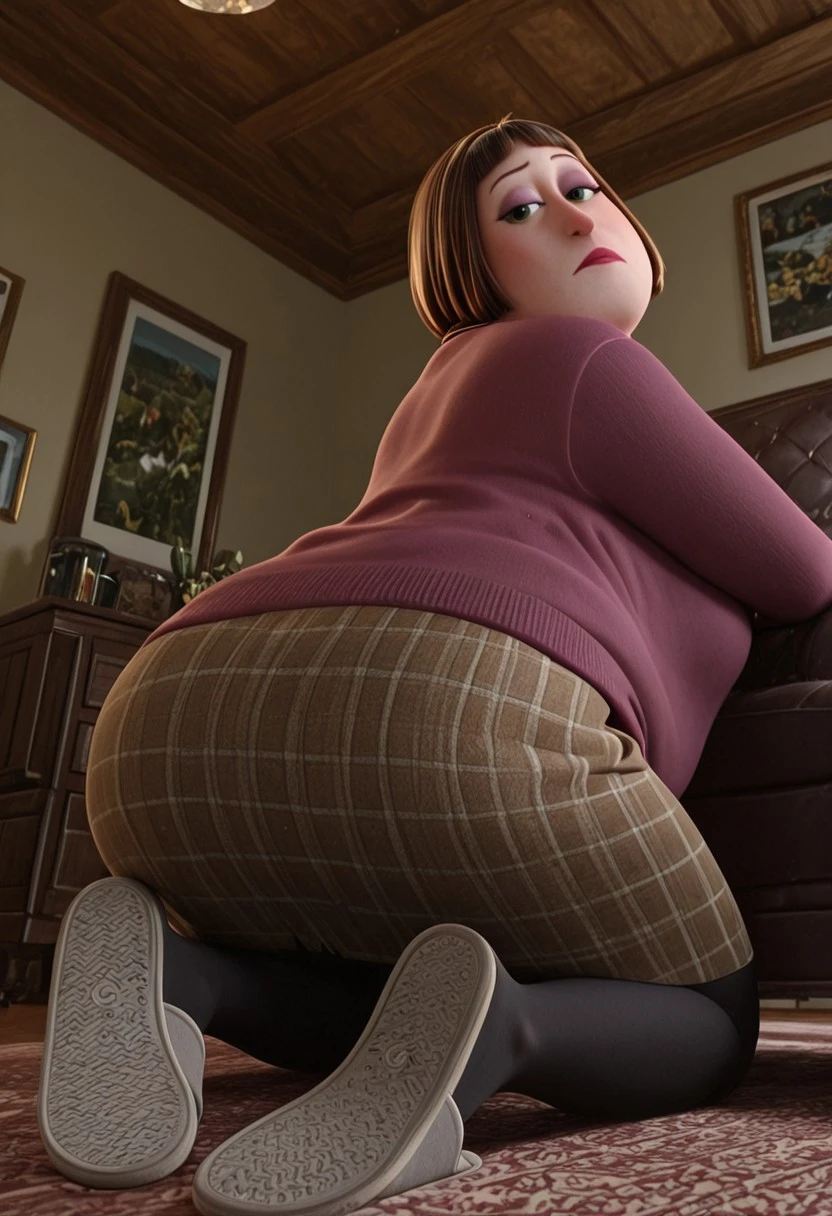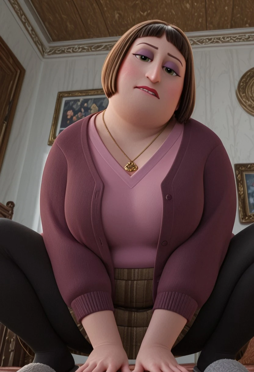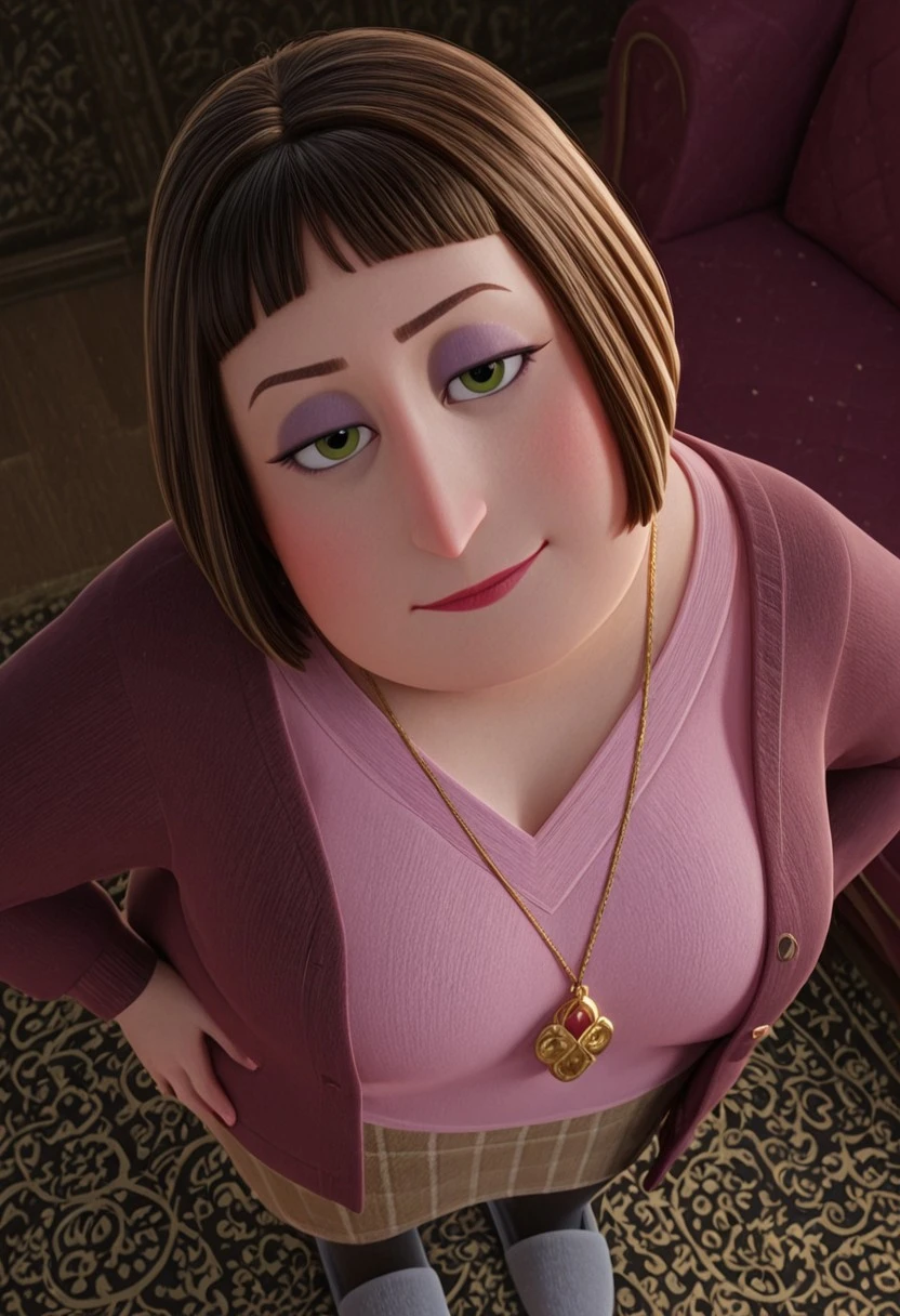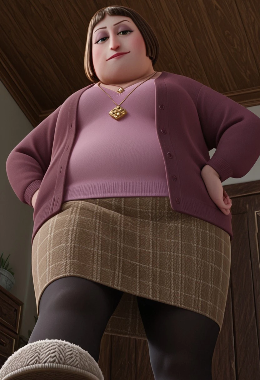 mrs_trapper_cozy, 1girl, mature, lady, plump, chubby, fat, brown hair, short bob, green eyes, pointy nose, makeup, purple eyeshadow, pink cheeks, red lipstick, gold pendant, pink shirt, purple linen cardigan, cream checkered skirt, black tights, grey slippers,