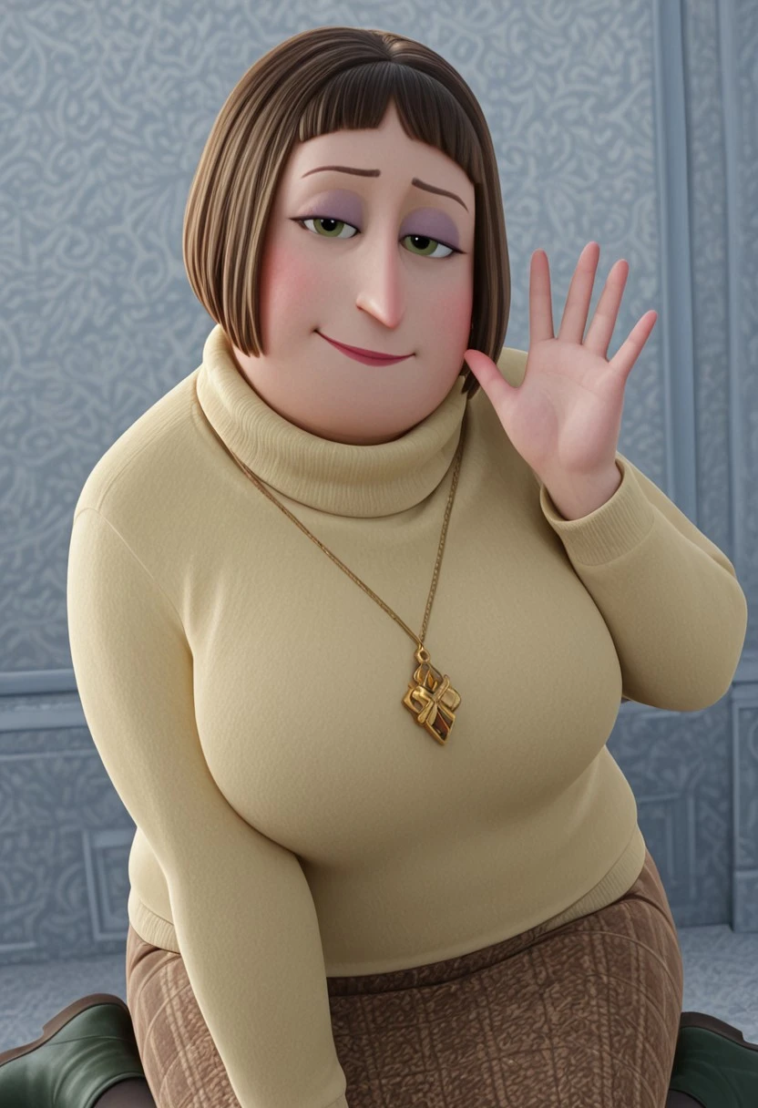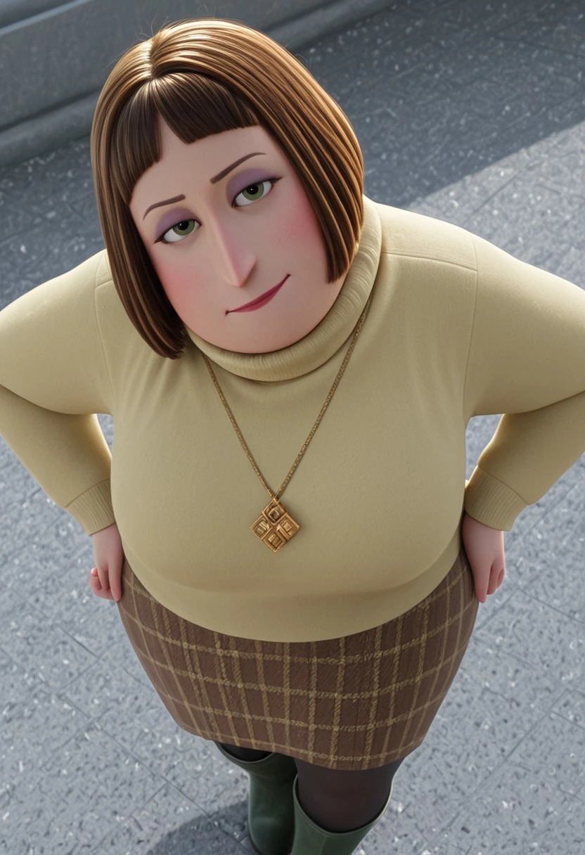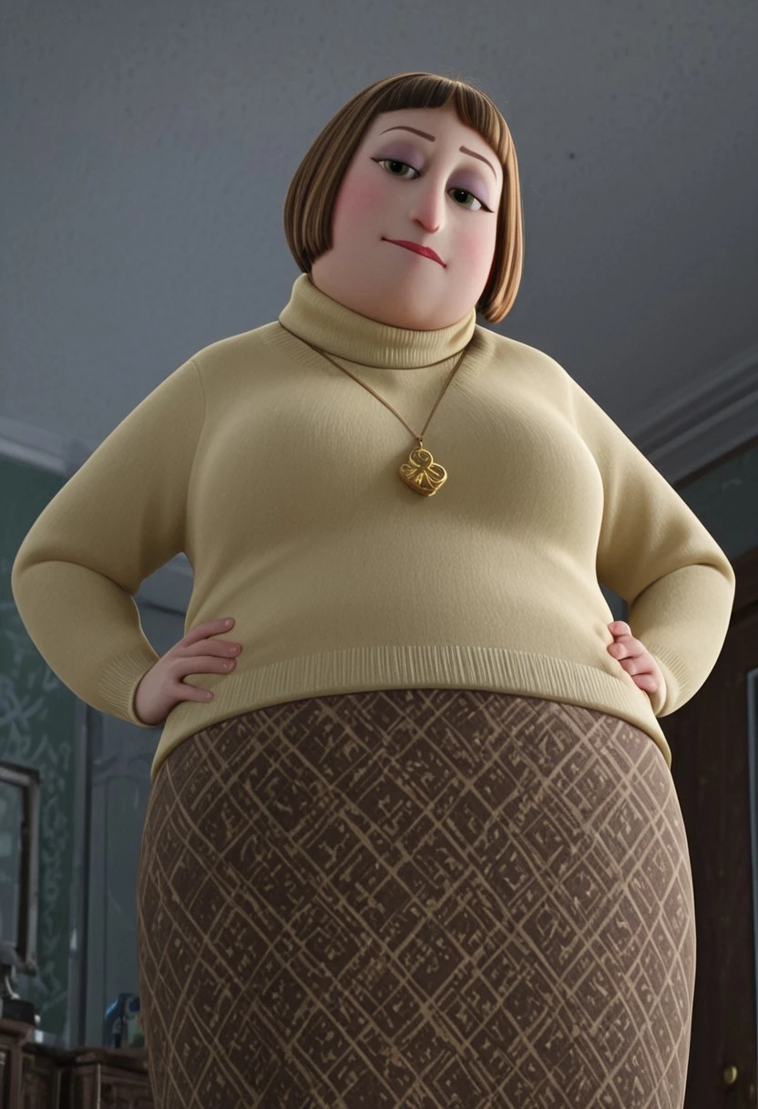 mrs_trapper_class, 1girl, mature, lady, plump, chubby, fat, brown hair, short bob, green eyes, pointy nose, makeup, purple eyeshadow, pink cheeks, red lipstick, gold pendant, yellow turtleneck sweater, cream checkered skirt, black tights, dark green boots,