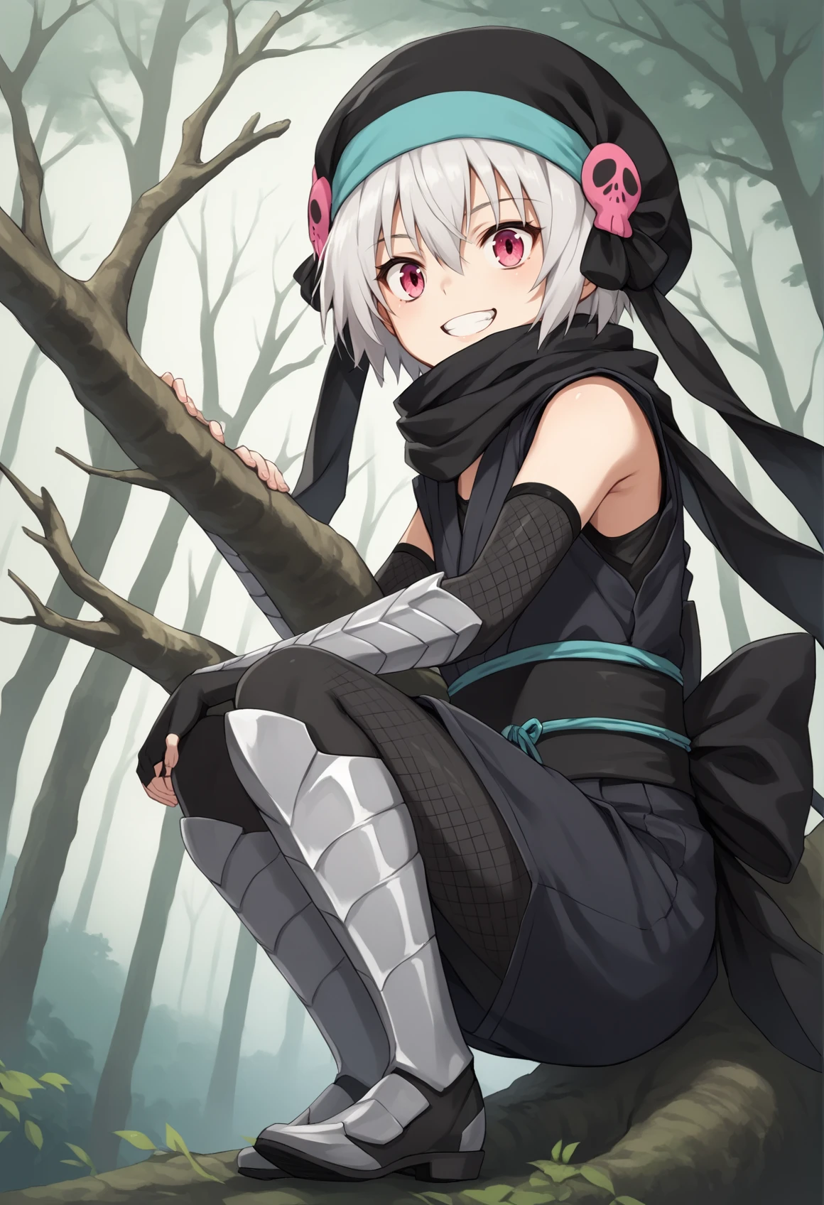 Notable tags: short hair, grey hair, pink eyes, hat, skull, ninja, scarf, bare shoulders, fishnets, gauntlets, fingerless gloves, greaves