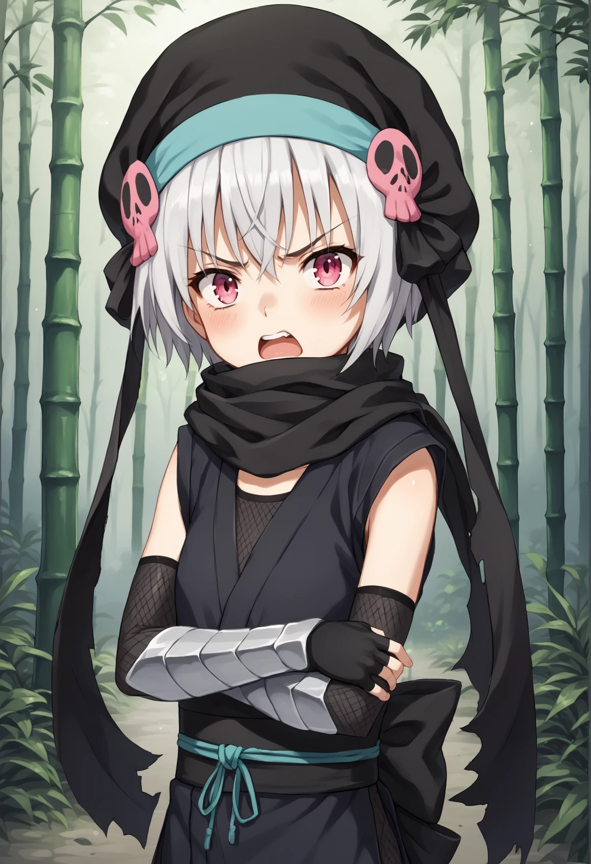 short hair, grey hair, pink eyes, hat, skull, ninja, scarf, bare shoulders, fishnets, gauntlets, fingerless gloves, greaves
