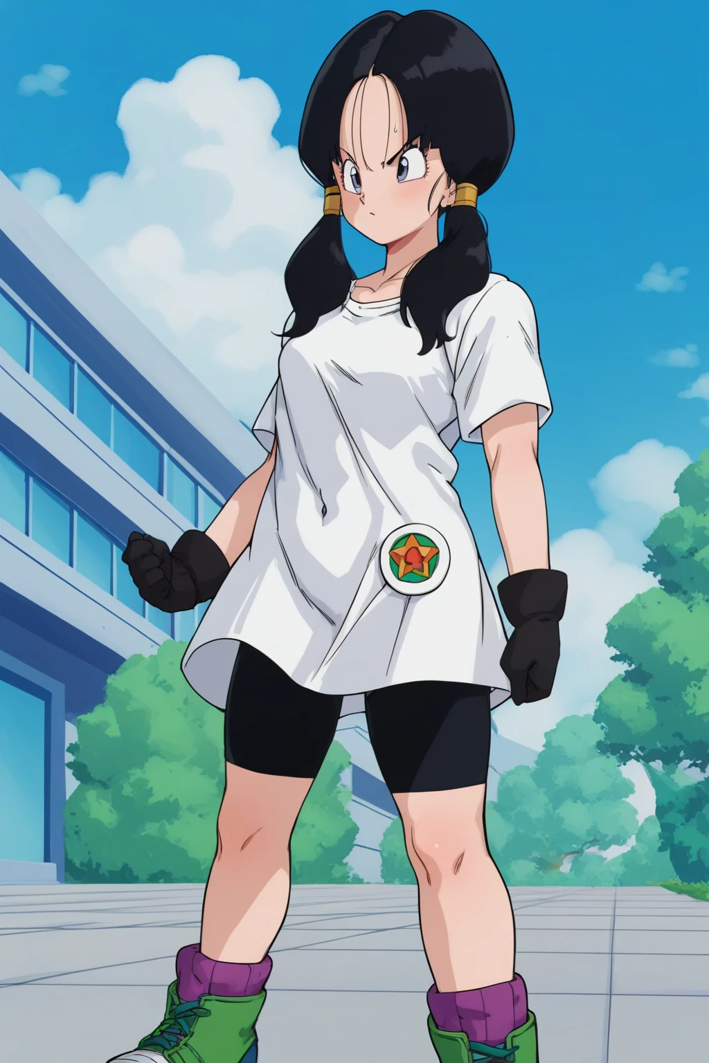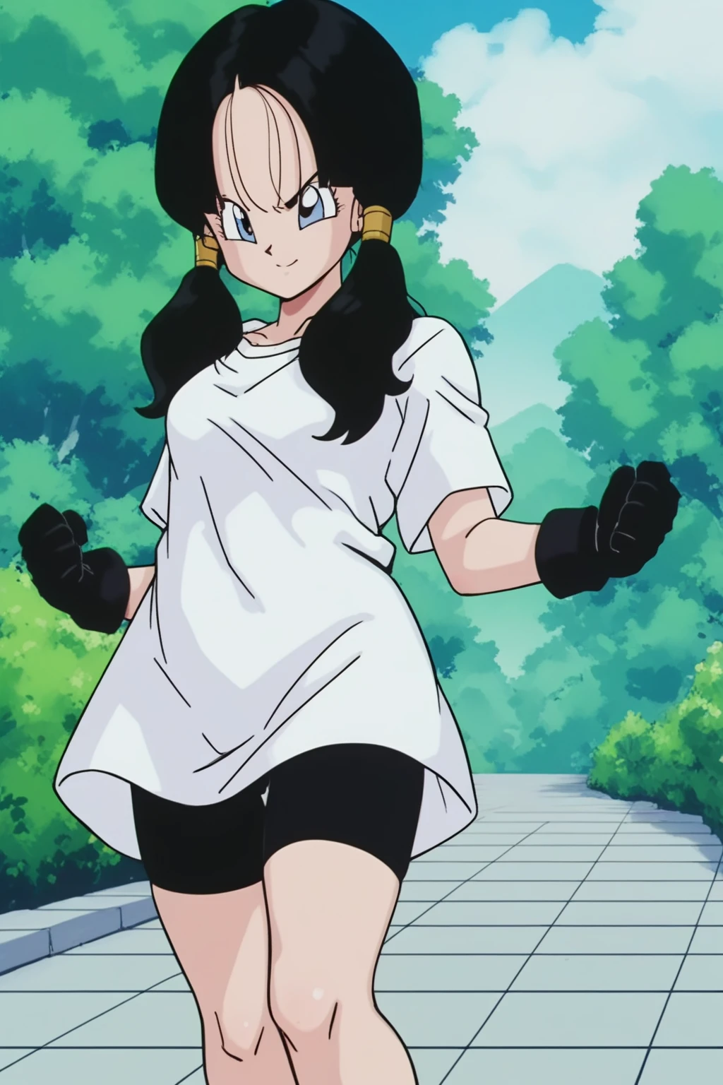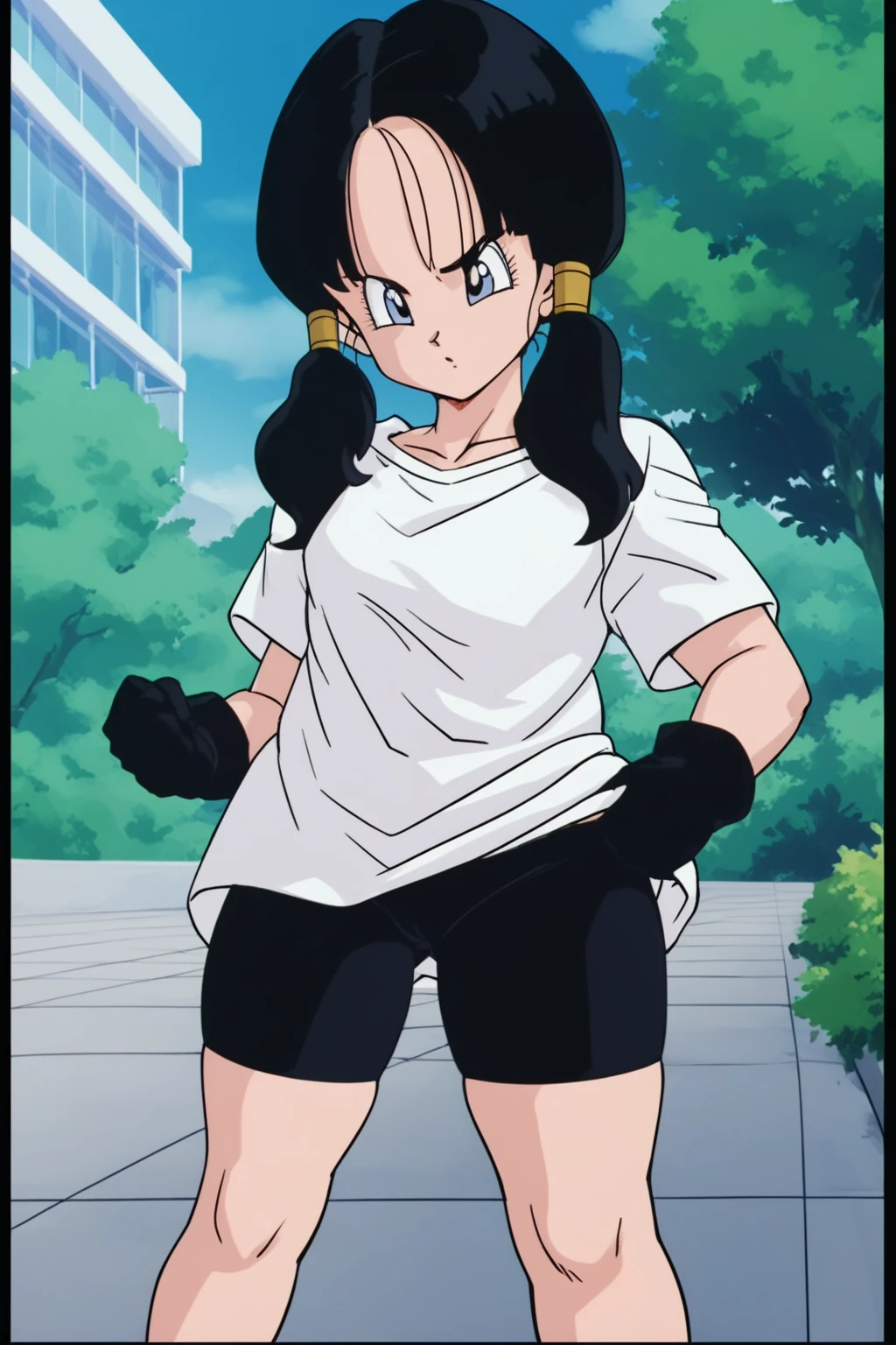 videl ,twintails, 1girl, bike shorts, white shirt, black hair, gloves,