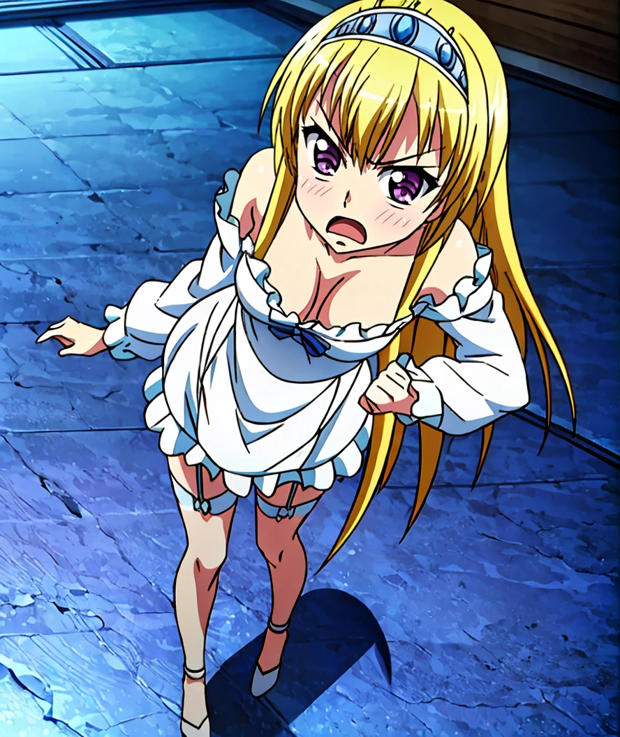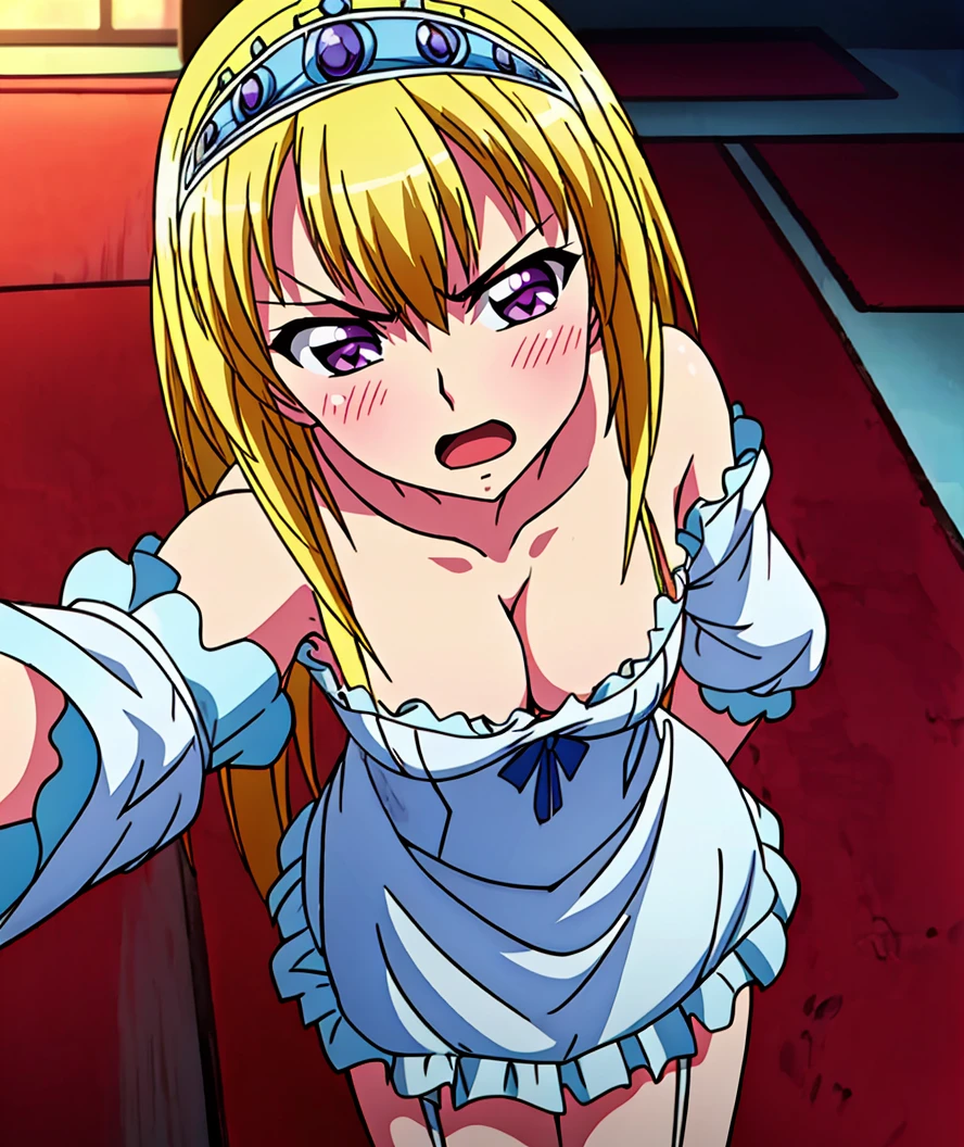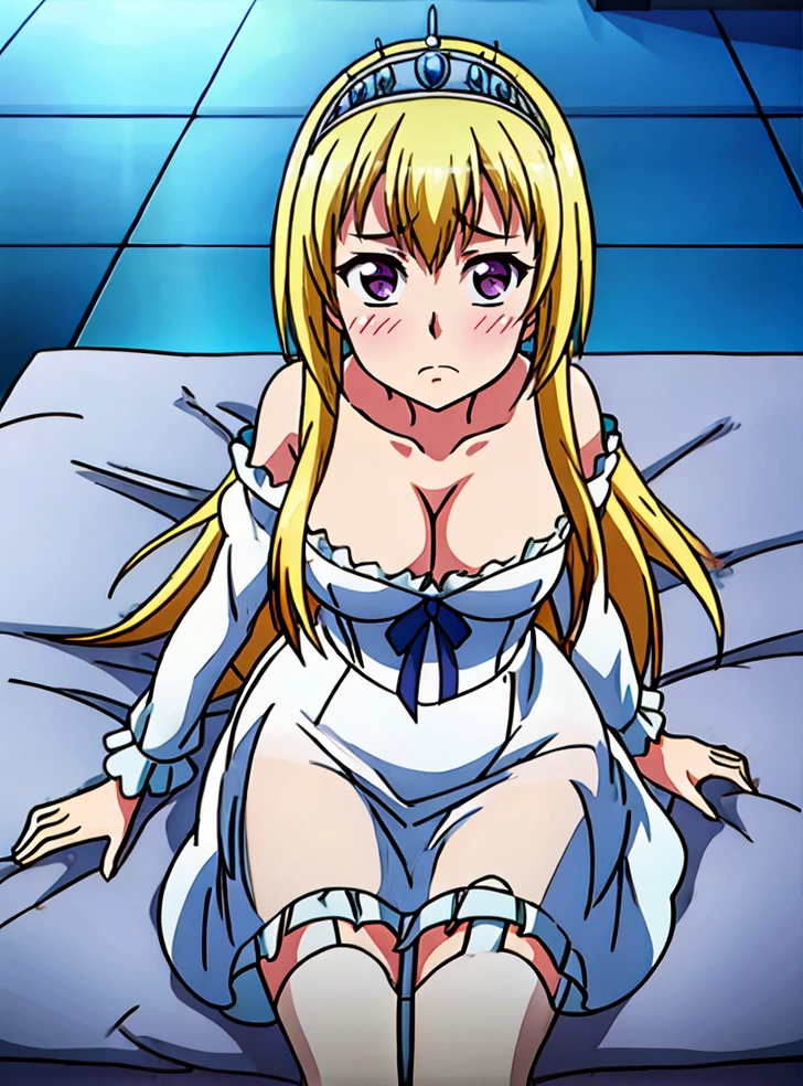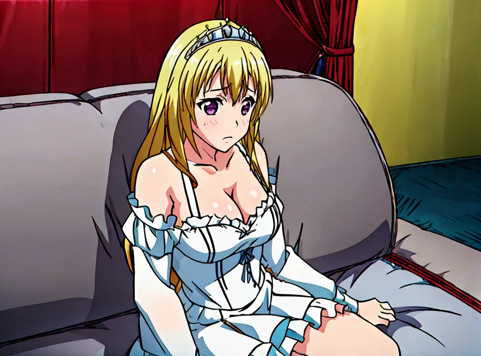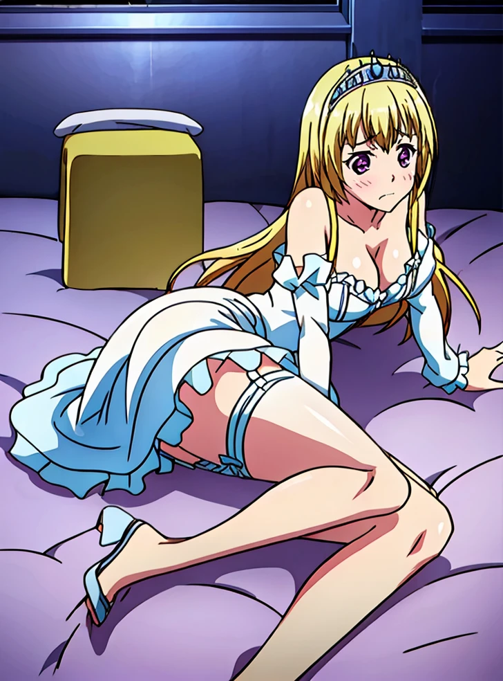 lun45h0l3, cleavage, blush, bangs, blonde hair, princess dress, bare shoulders, very long hair, purple eyes, frills, white dress, garter straps, tiara, frilled sleeves,