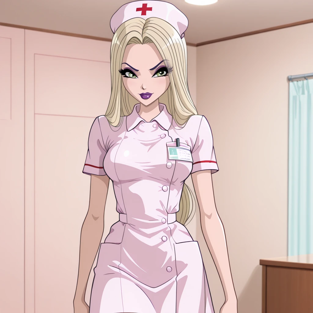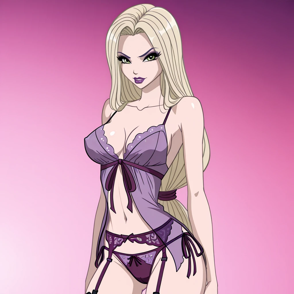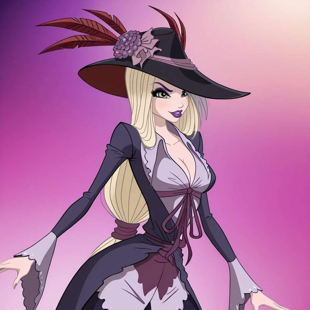 VenomyaWinxClub, 1girl, hat feather, blonde hair, long hair, makeup, lipstick, purple lips, dress, green eyes, breasts, cleavage, long sleeves, cowboy shot