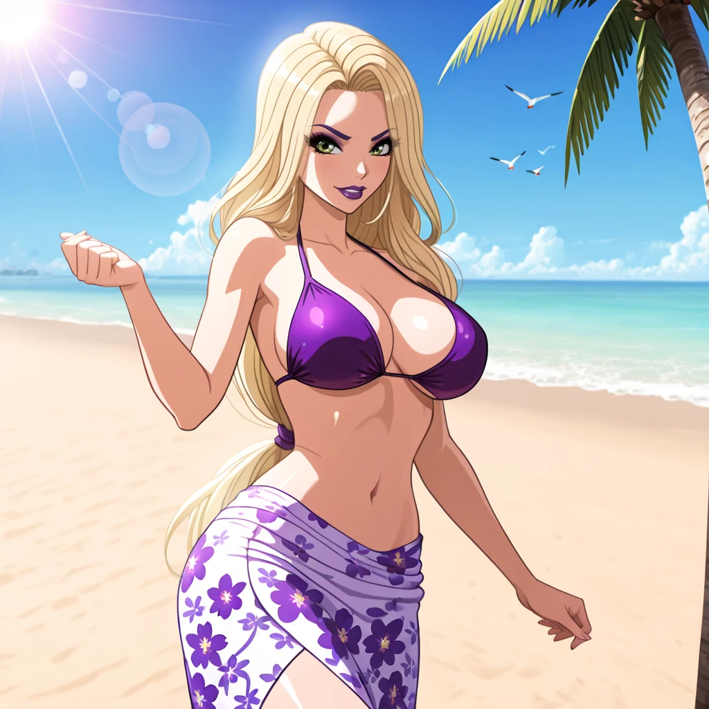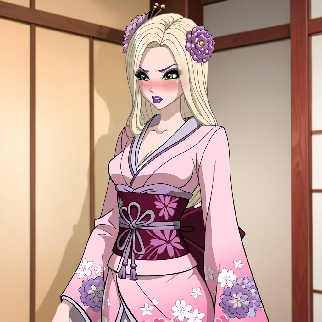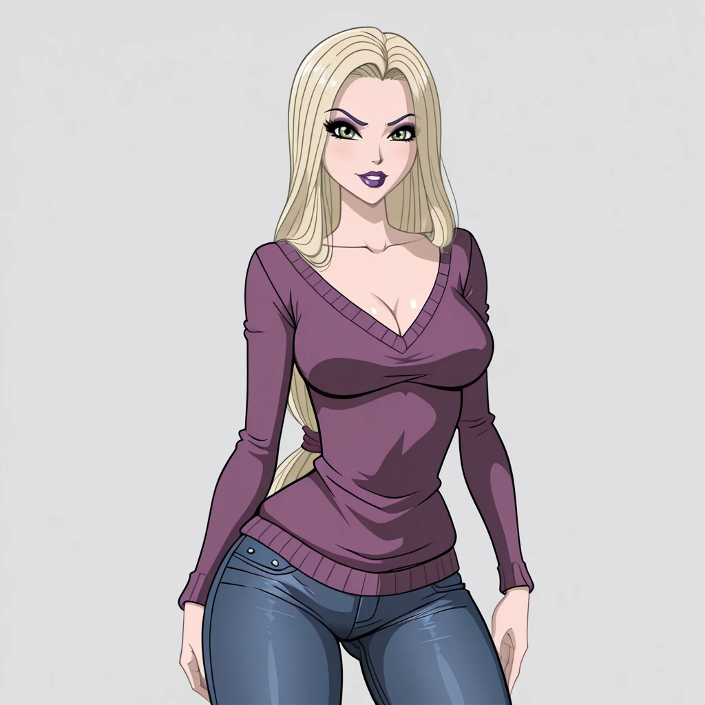 VenomyaWinxClub, 1girl, hat feather, blonde hair, long hair, makeup, lipstick, purple lips, dress, green eyes, breasts, cleavage, long sleeves, cowboy shot