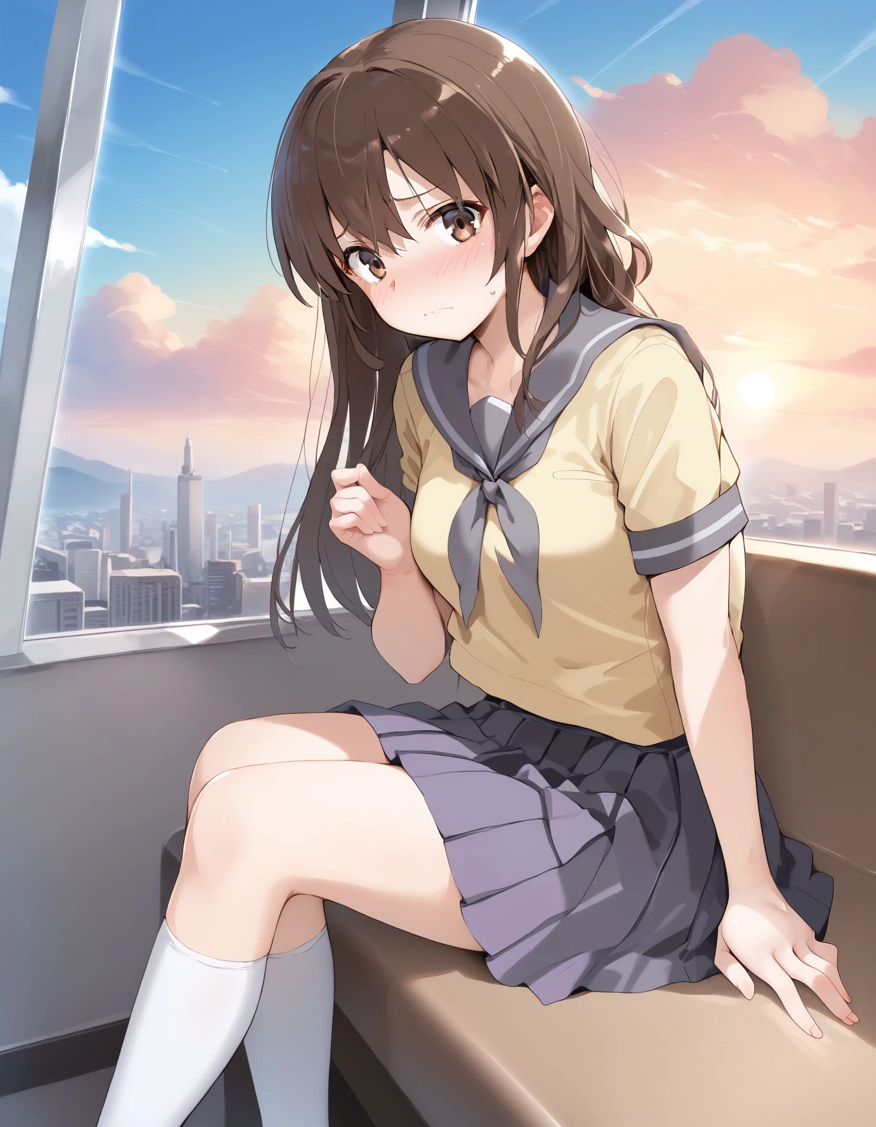 lass bw,grey sailor collar,grey neckerchief,yellow serafuku,skirt,socks,loafers