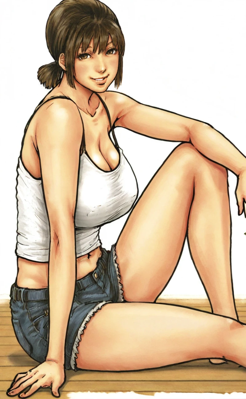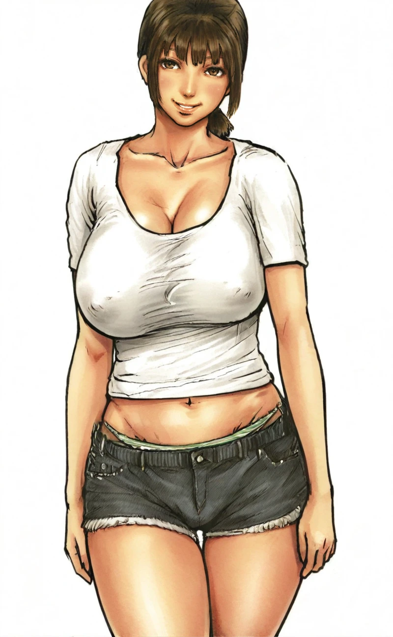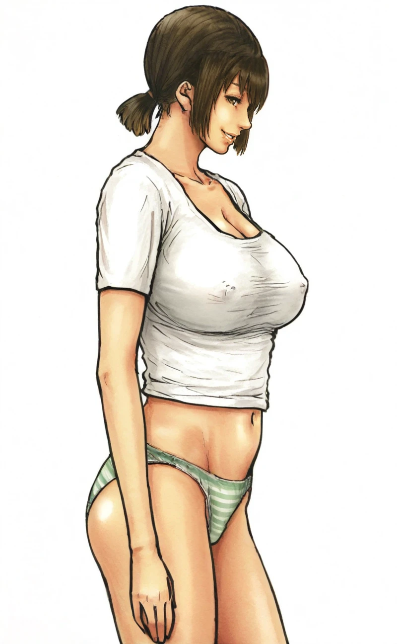 katano, (huge breasts:0.8), low ponytail, short hair, brown hair, brown eyes, mature female, traditional_media,