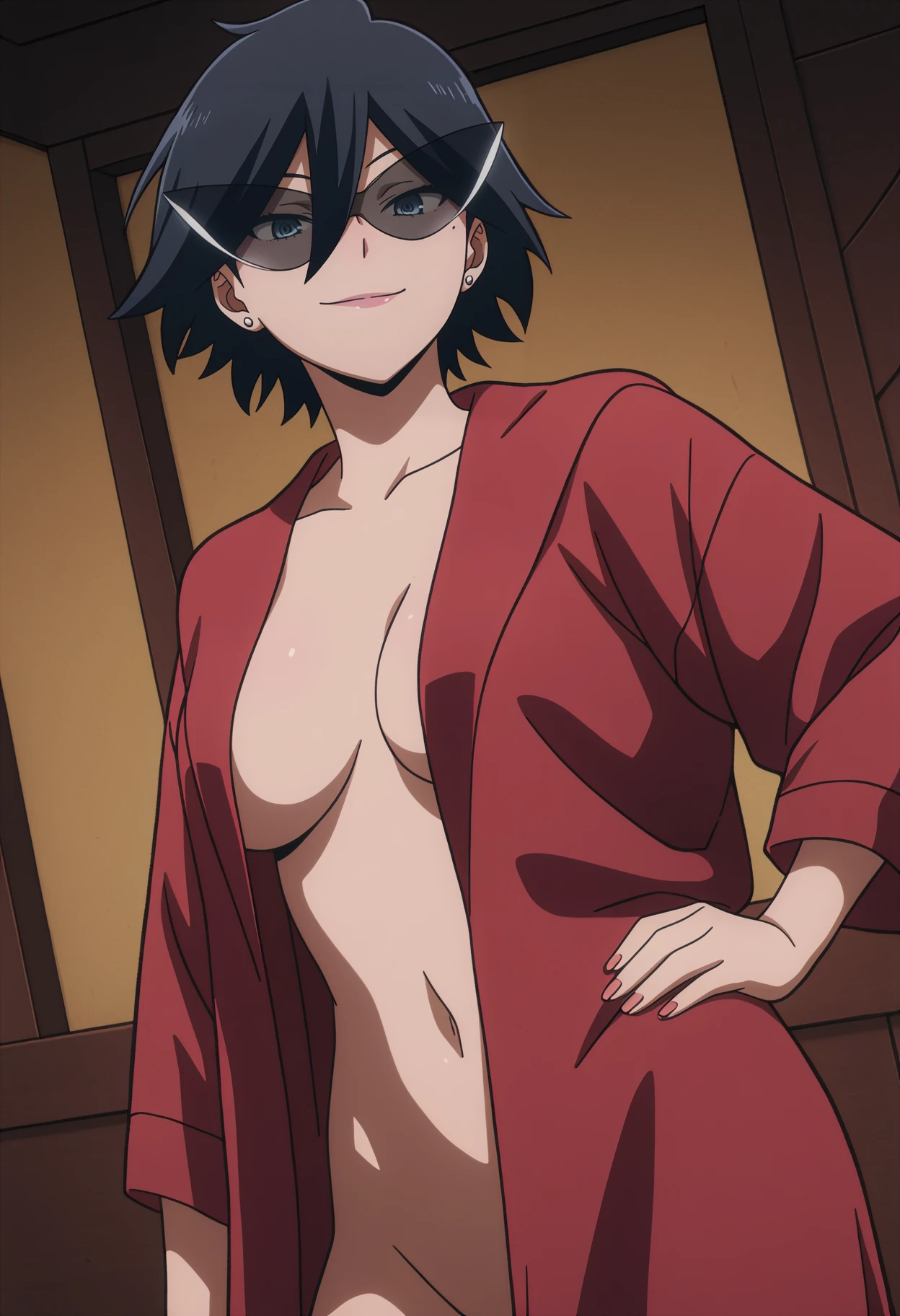 1girl,solo,anime coloring,mm,short hair,black hair,mole under eye,blue eyes,earrings,makeup