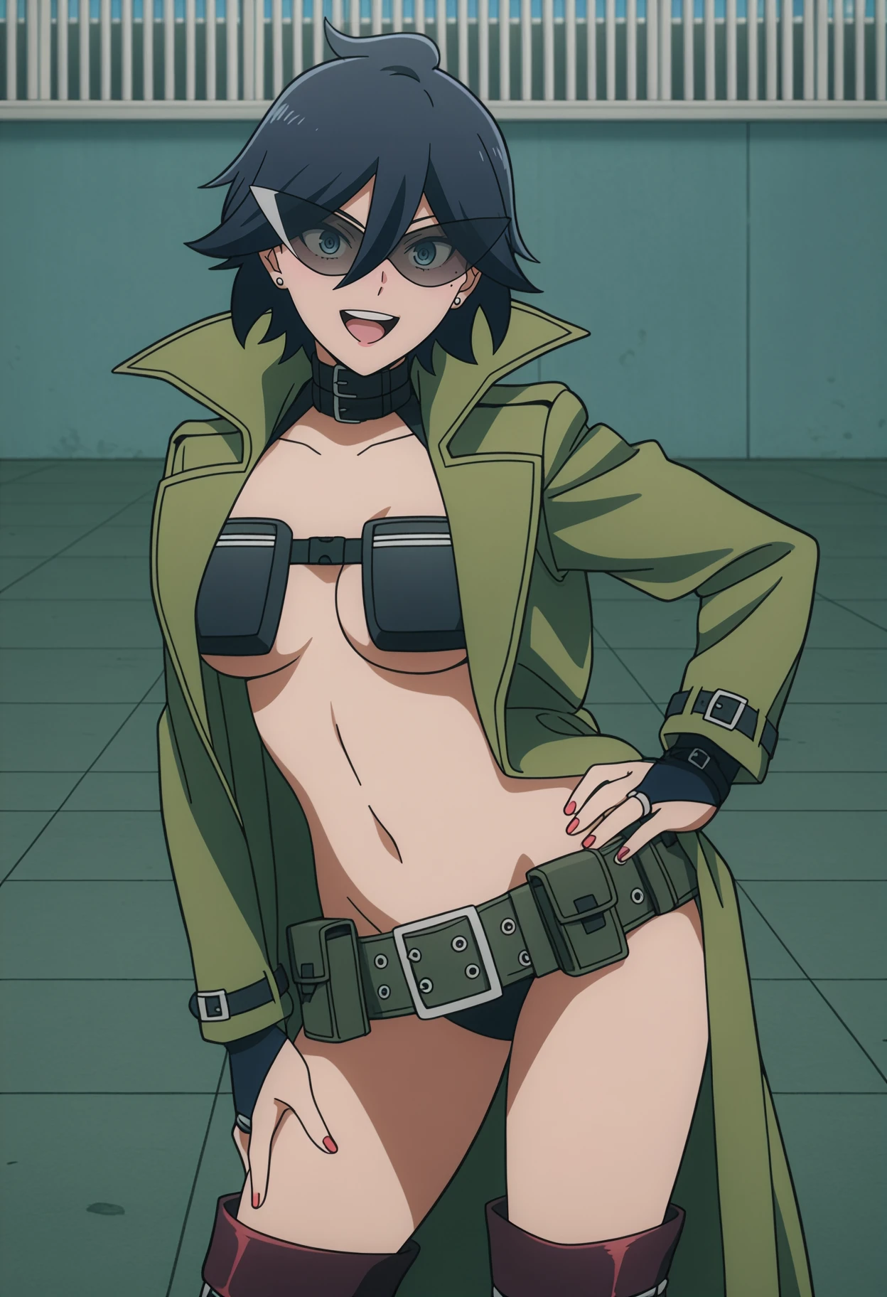 past hero form,sunglasses,green coat,trench coat,revealing clothes,chest harness,belt bra,pouch,utility belt,belt skirt,fingerless gloves,black gloves,bridal gauntlets,thigh boots,brown thigh boots
