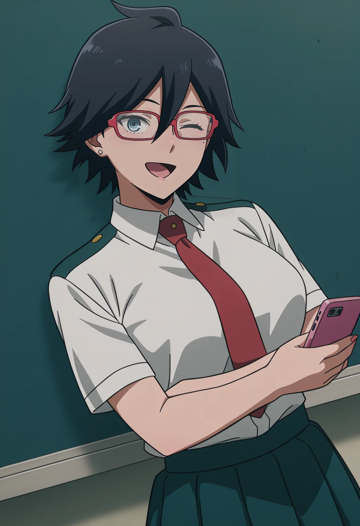 school uniform,white shirt,collared shirt,red necktie,shirt tucked in,green skirt,pleated skirt,kneehighs, black socks, white footwear