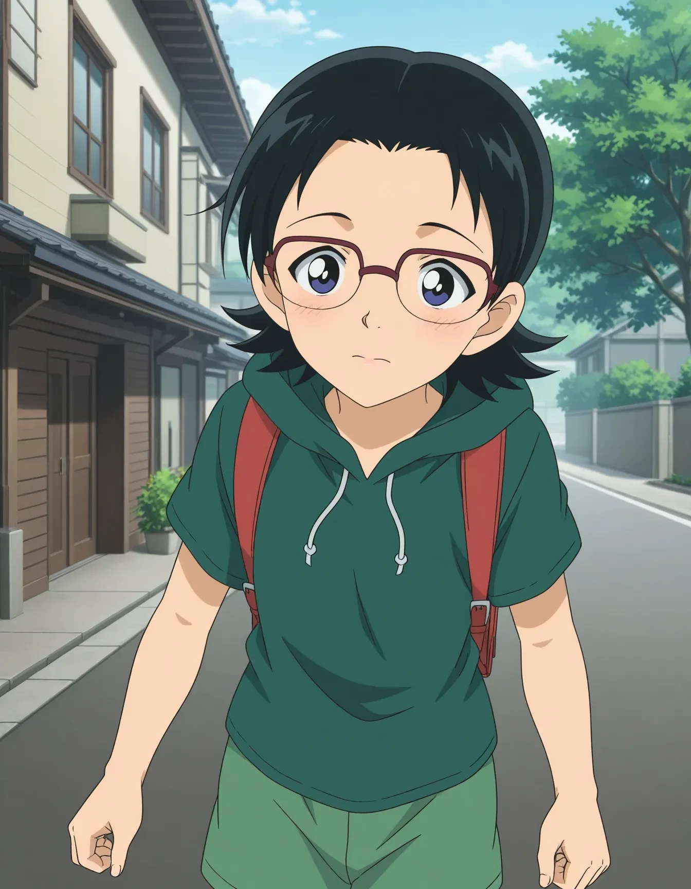 aged down,deformed,medium hair,parted bangs,green hoodie,short sleeves,green shorts,white socks,frilled socks,green footwear,black backpack,