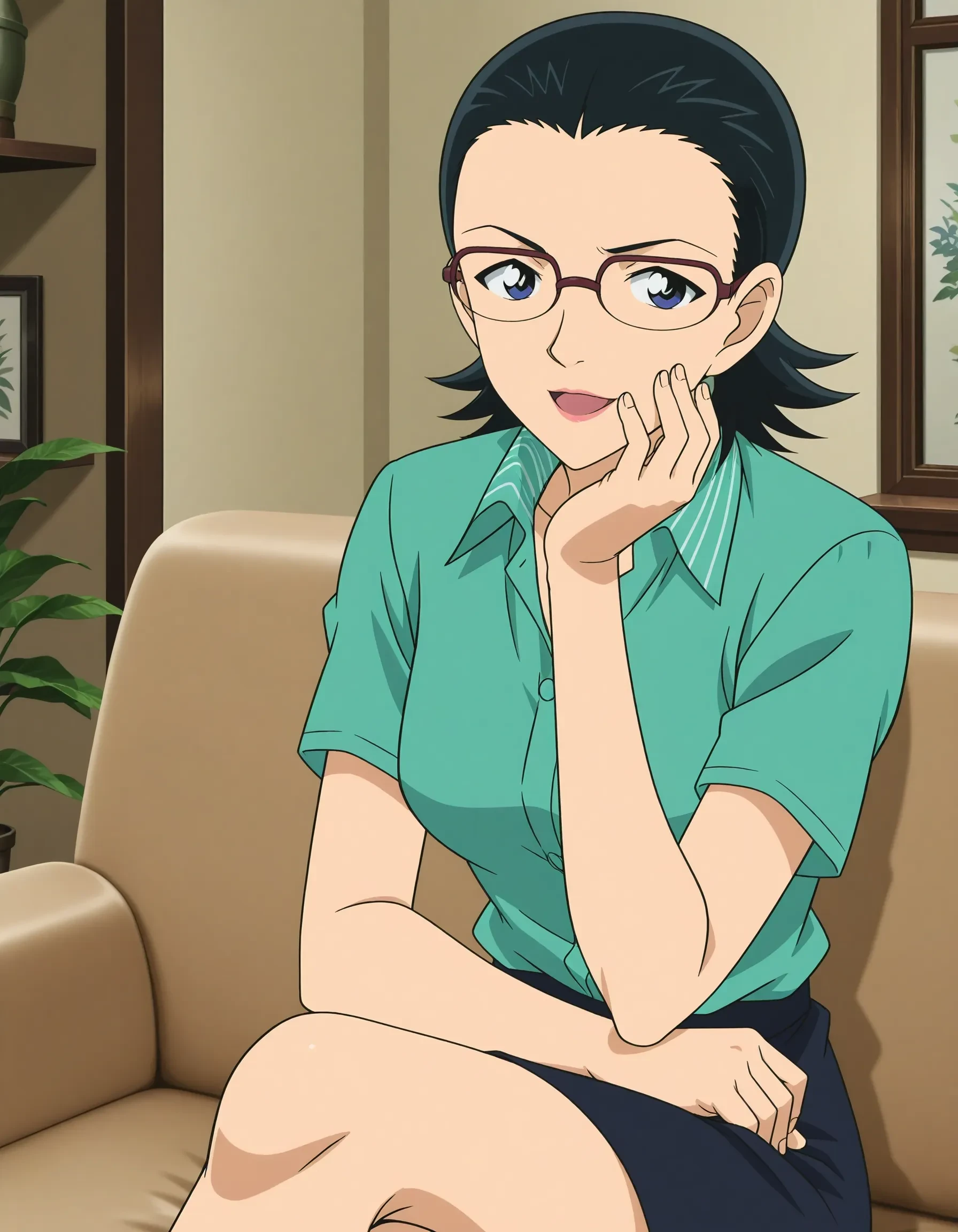 green dress shirt,short sleeves,pencil skirt,black skirt,