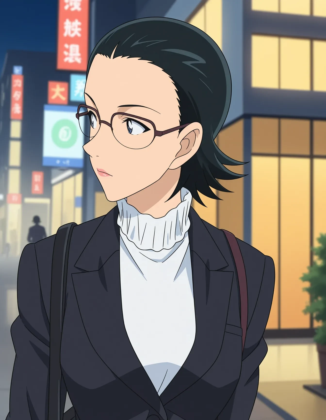 black jacket,suit jacket,skirt suit,long sleeves,white turtleneck,frilled turtleneck,formal,