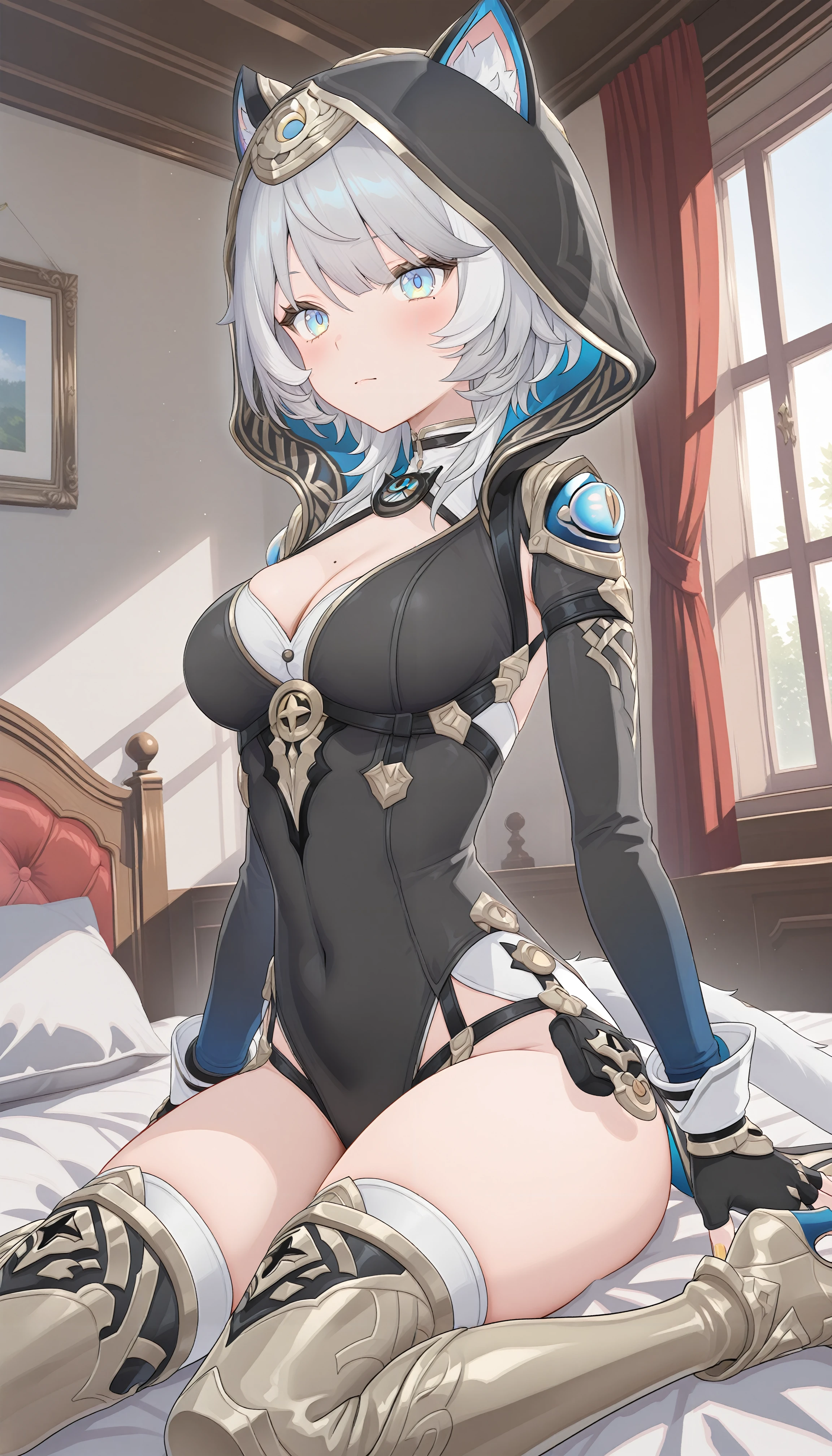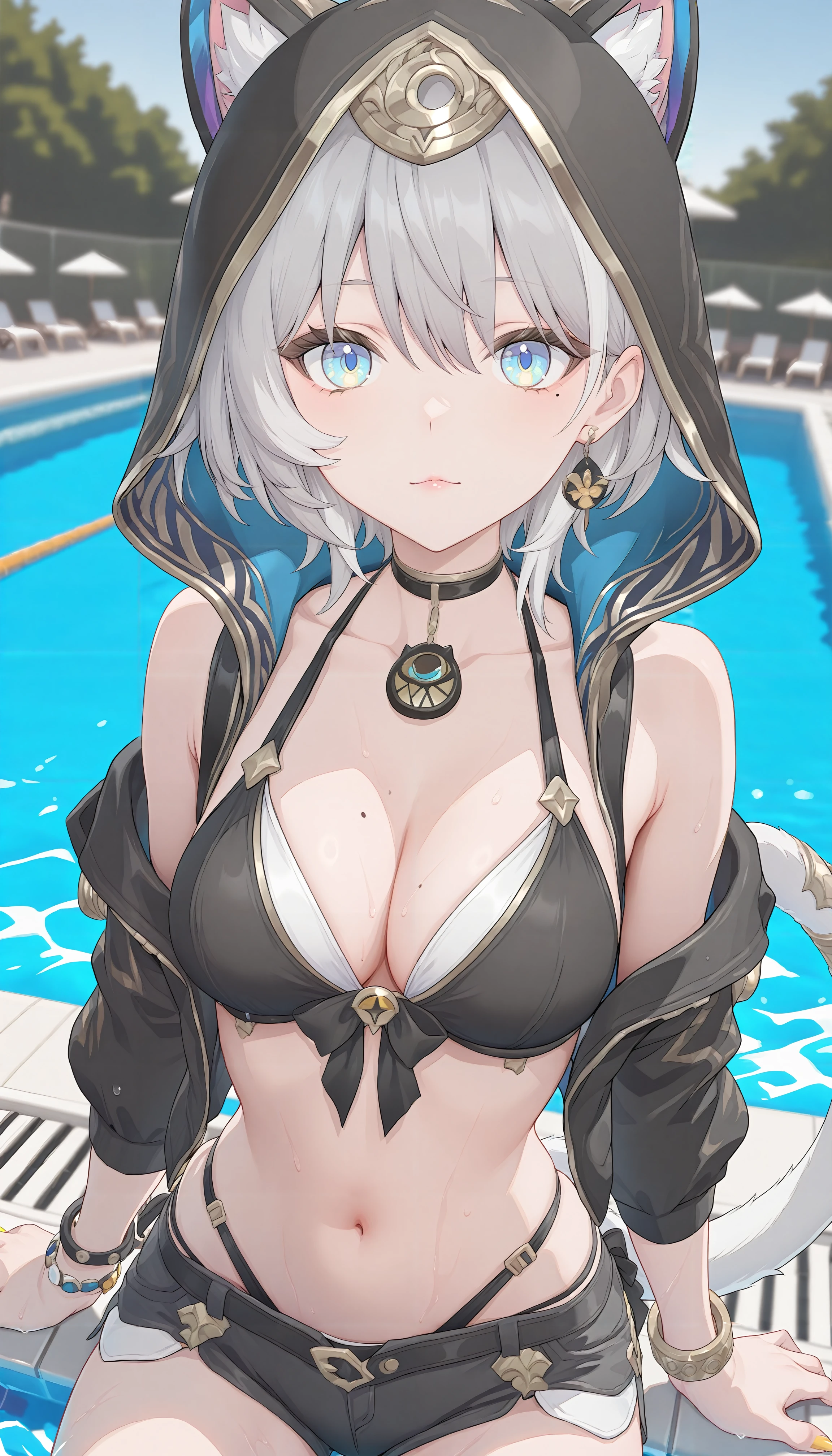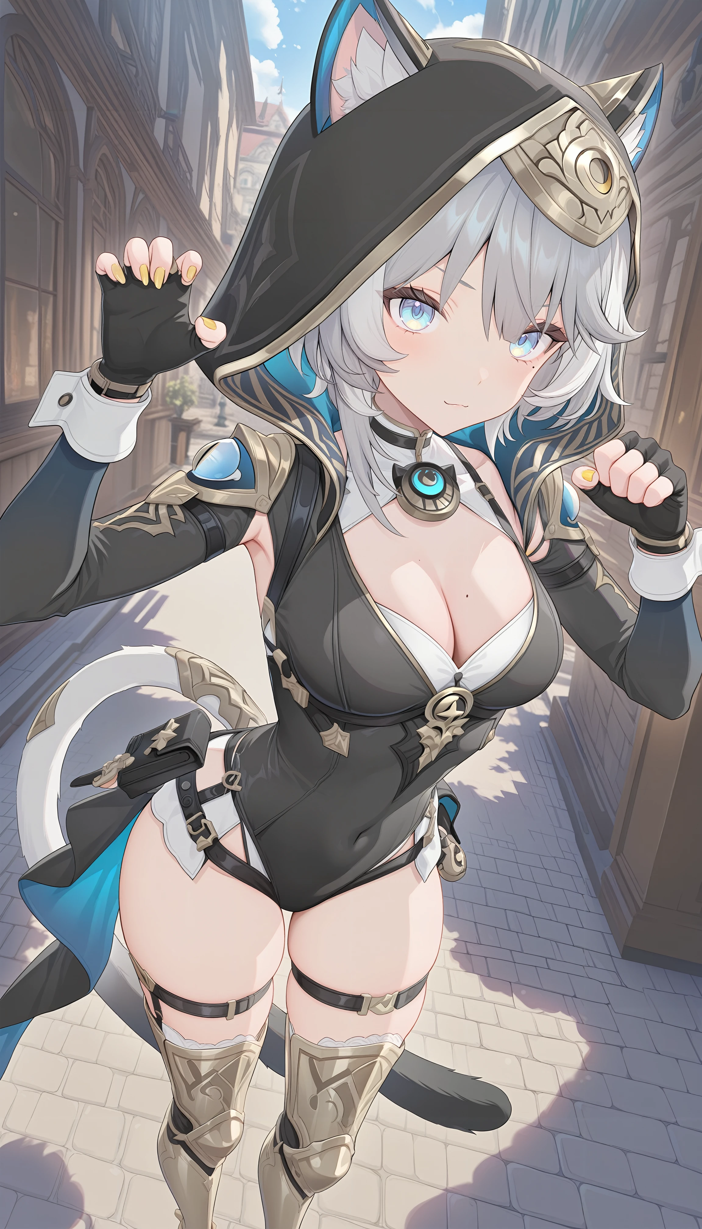 tj_cipher,medium breasts,cat ears,animal ears,hood,hood up,blue eyes,multicolored hair,short hair,bangs,white hair,grey hair,