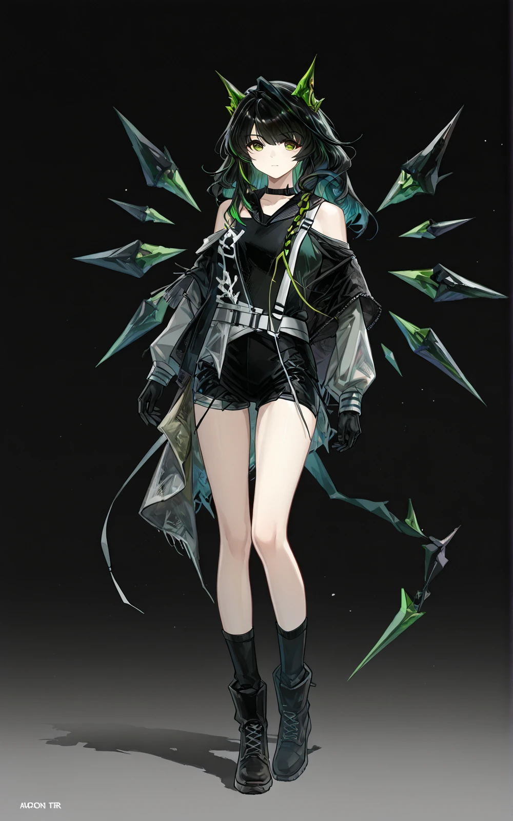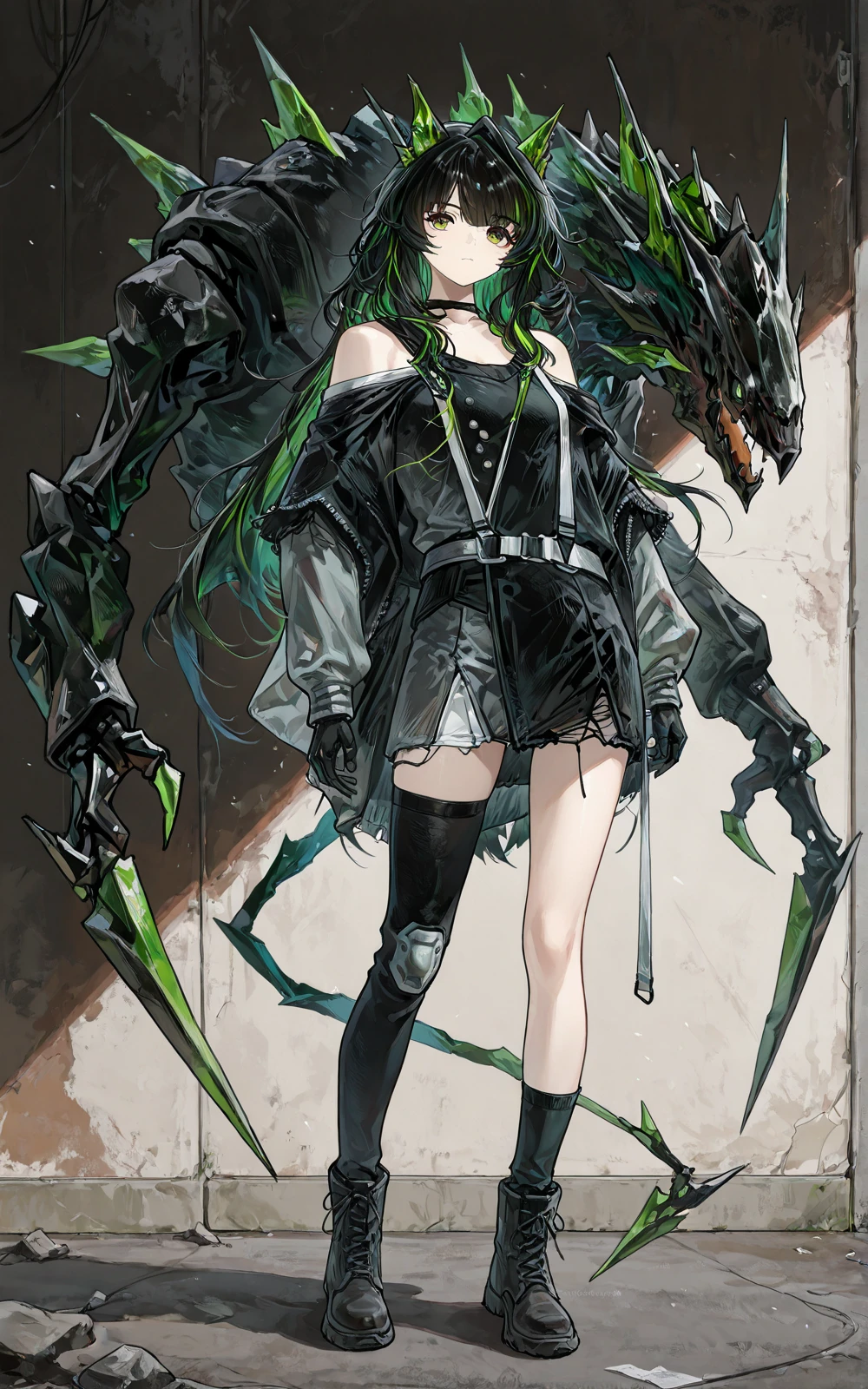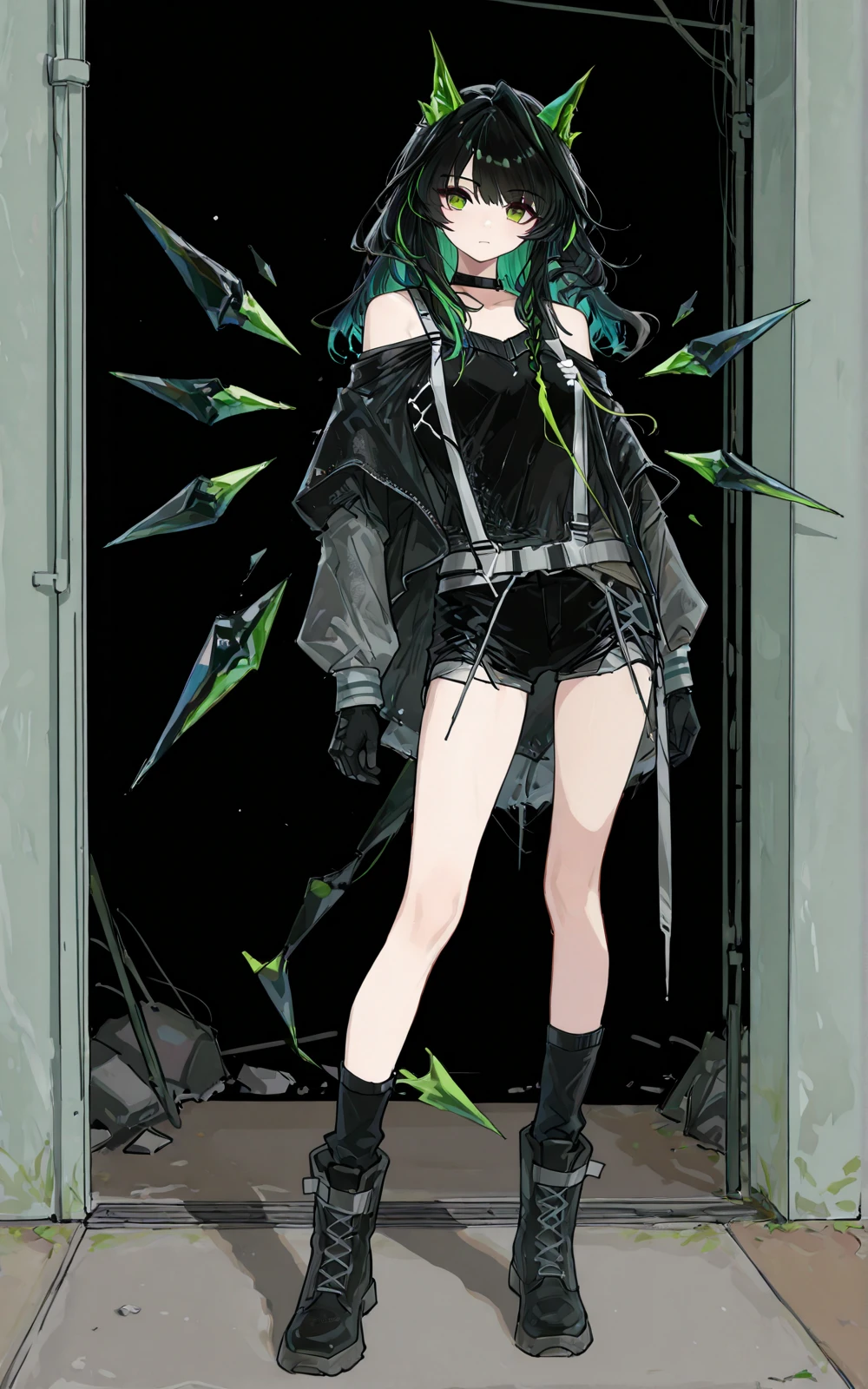 long black hair with green highlights, green cat ears, green eyes, full body, standing, black off-shoulder top, black gray jacket, black shorts, black gloves, black socks, black combat boots, black choker, techwear, asymmetrical_legwear,mon3tr_(arknights)