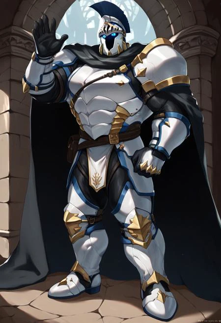 1boy, ae_dyne, knight, helmet, faceless, blue eyes, cloak, breastplate, shoulder pads, gloves, pants, boots, bara,