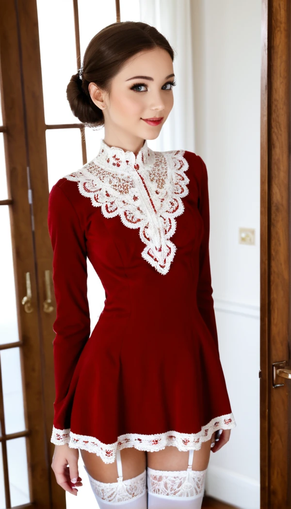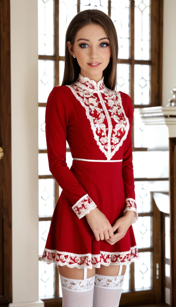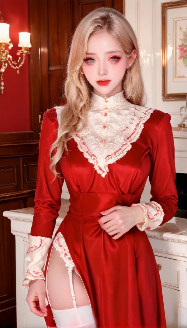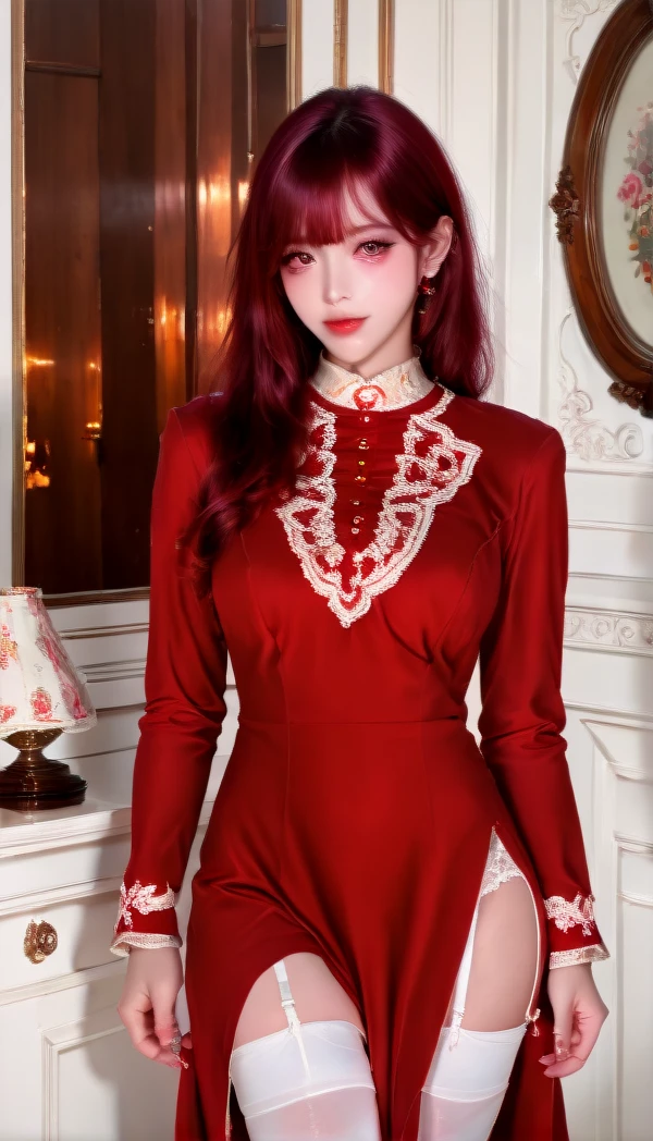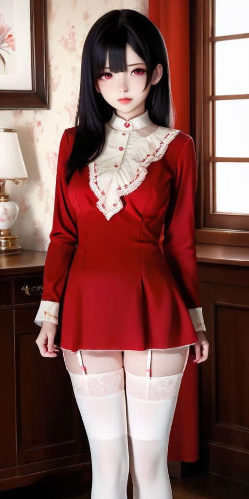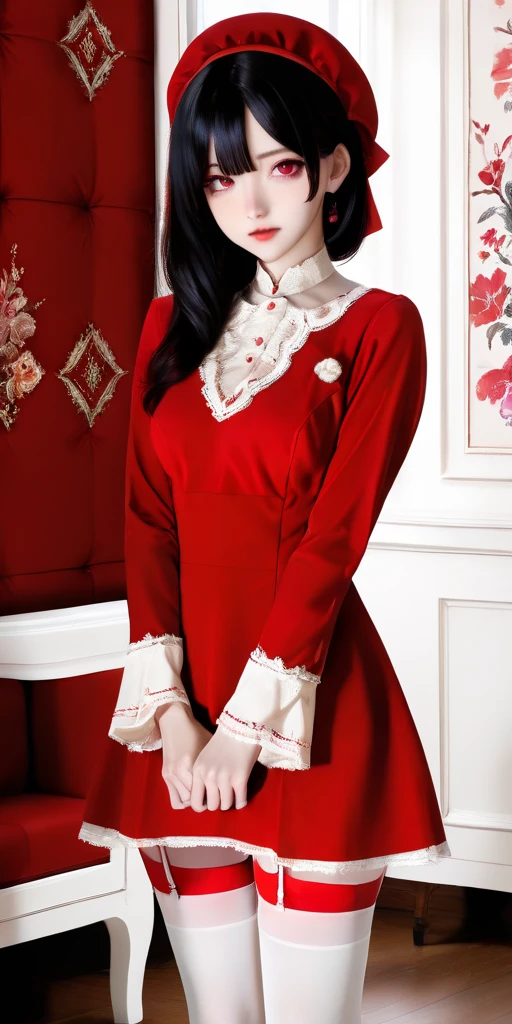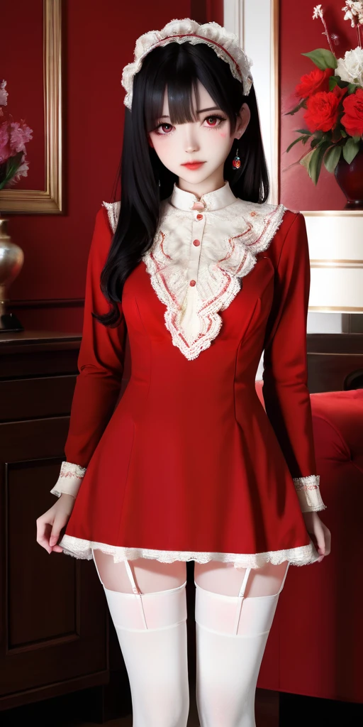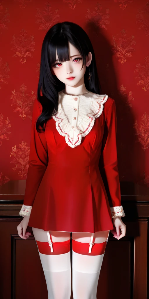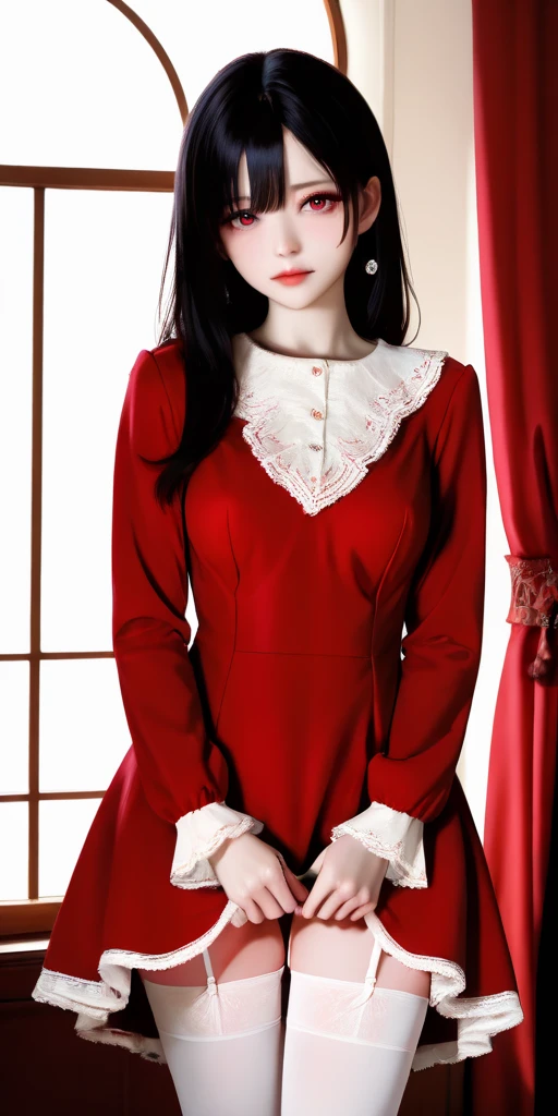 Prompt word:red-dress, white thighhighs, dress, red dress, garter straps, long sleeves