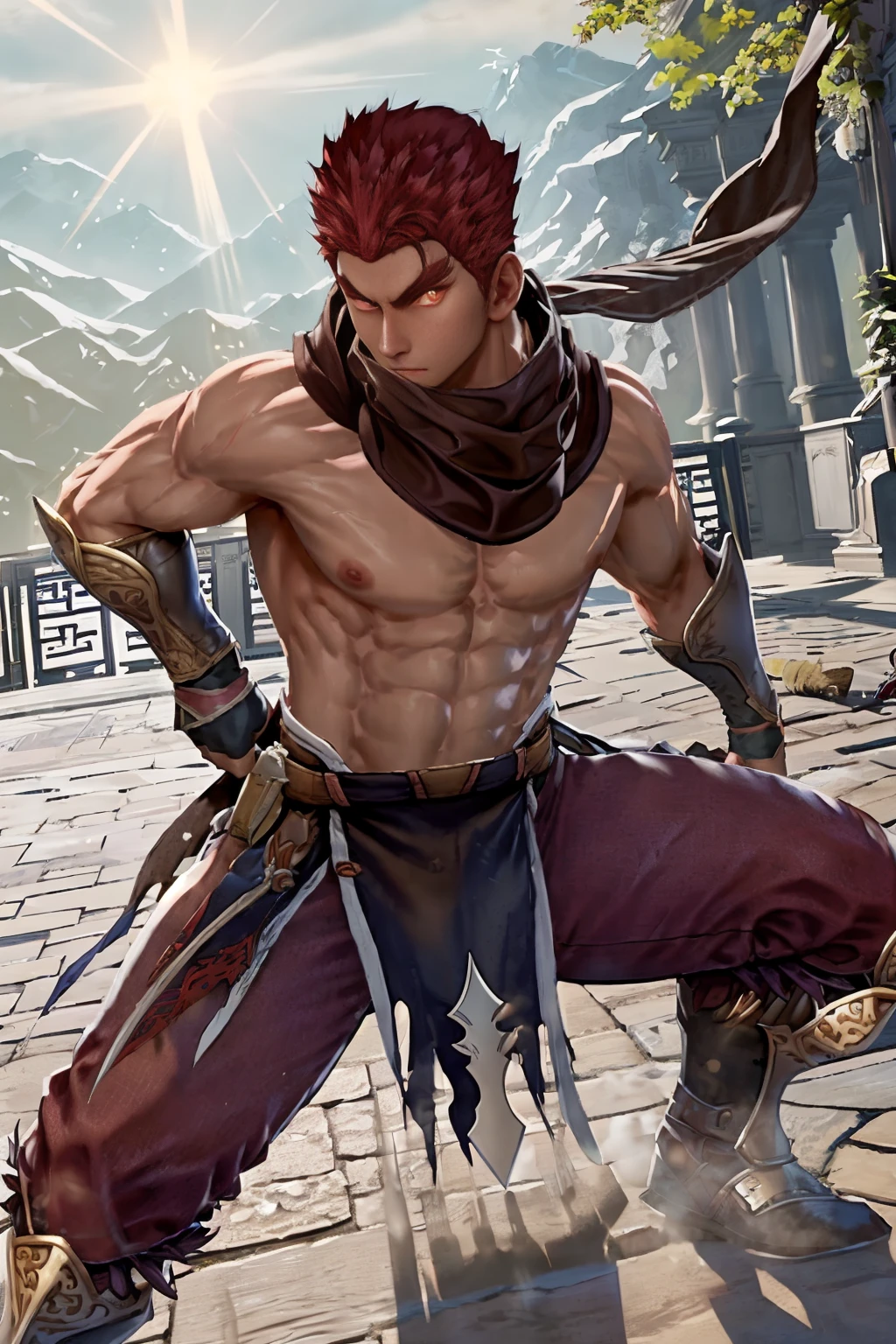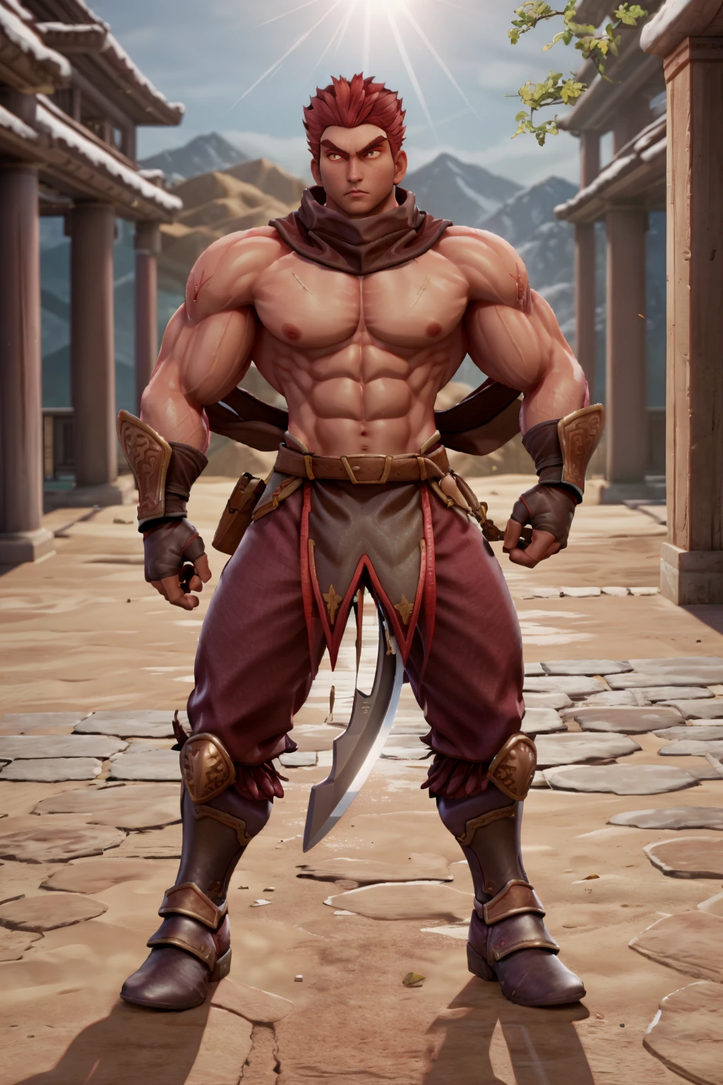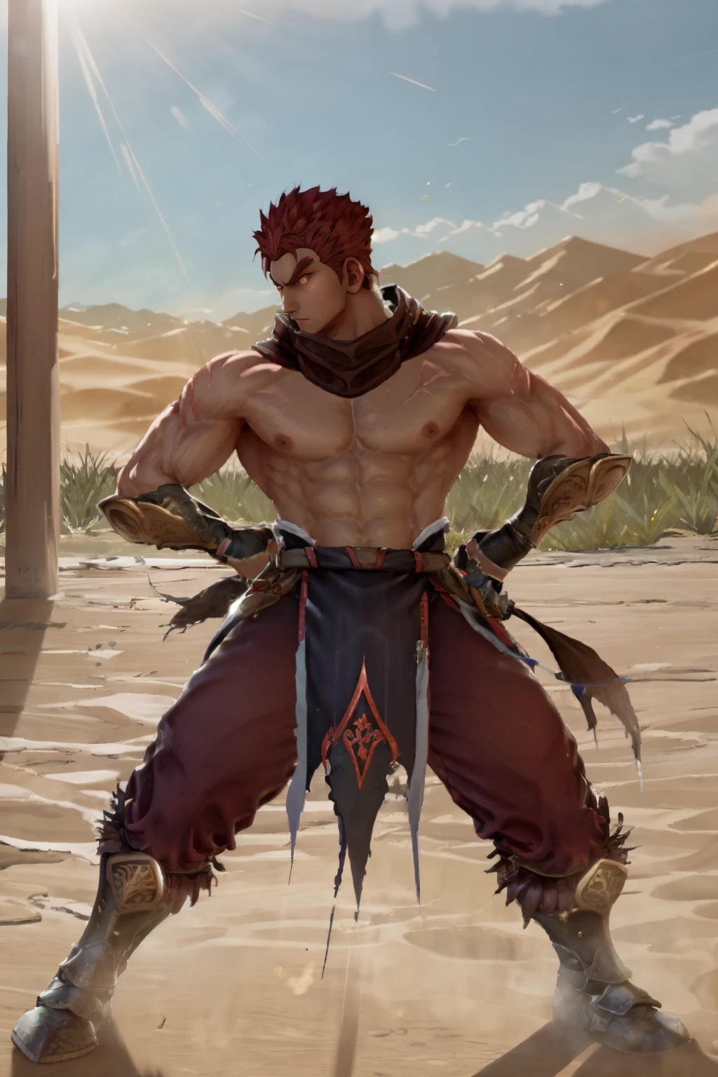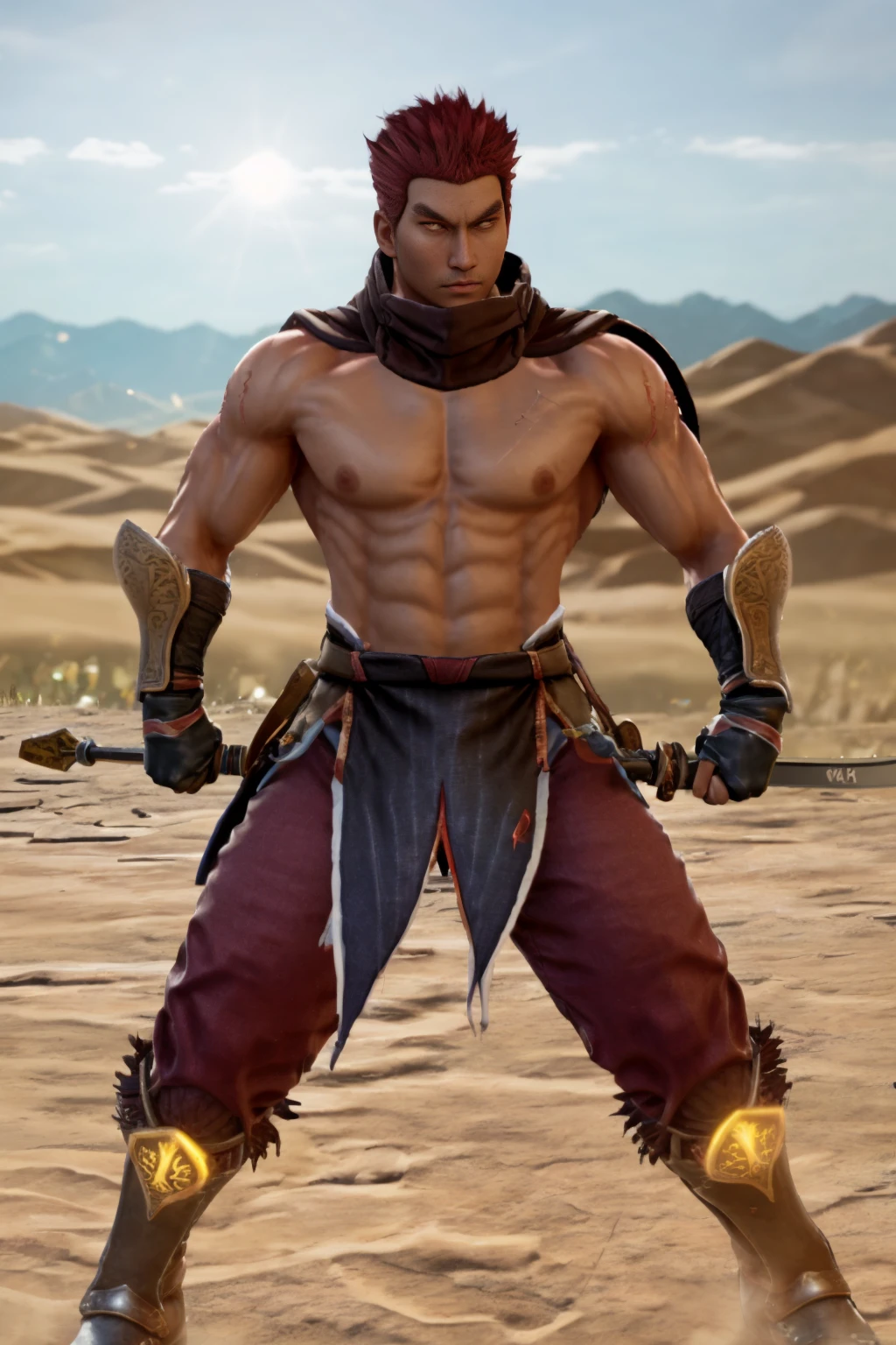 1guy, DHWANG, dark skin, red hair, red eyes, yellow iris, yellow pupils, brown scarf, chest cross scar, topless male, armored wristbands, brown gloves, brown loincloth, red korean pants, belt, sword, chinese sword, armored boots,
