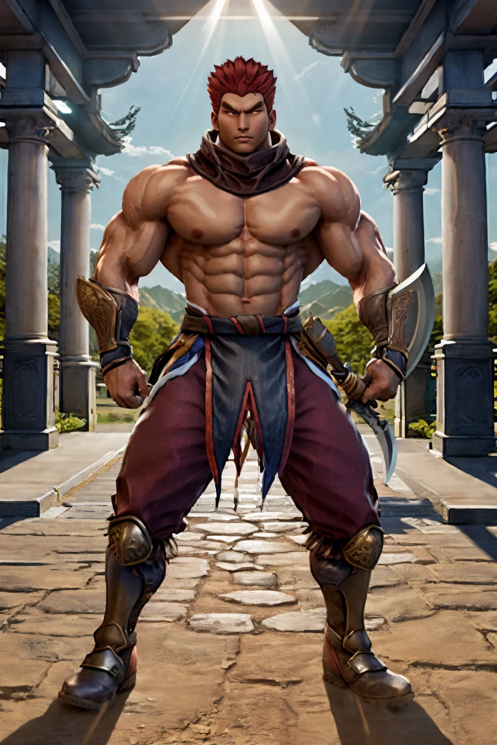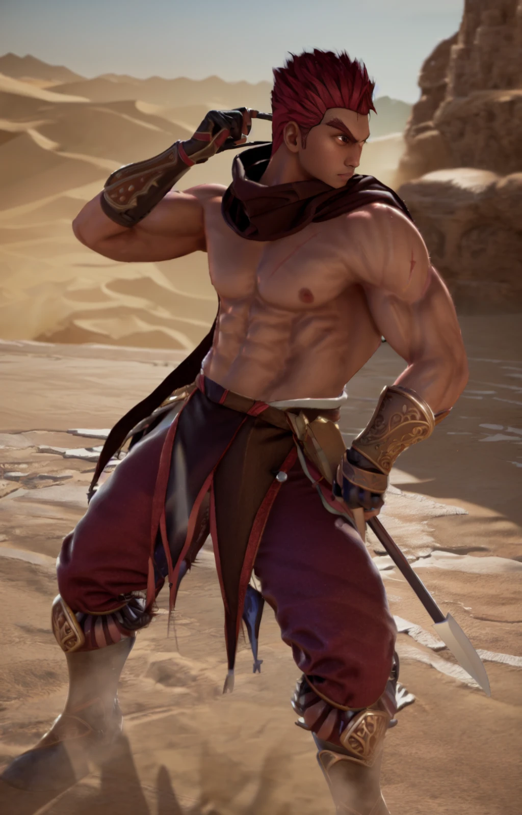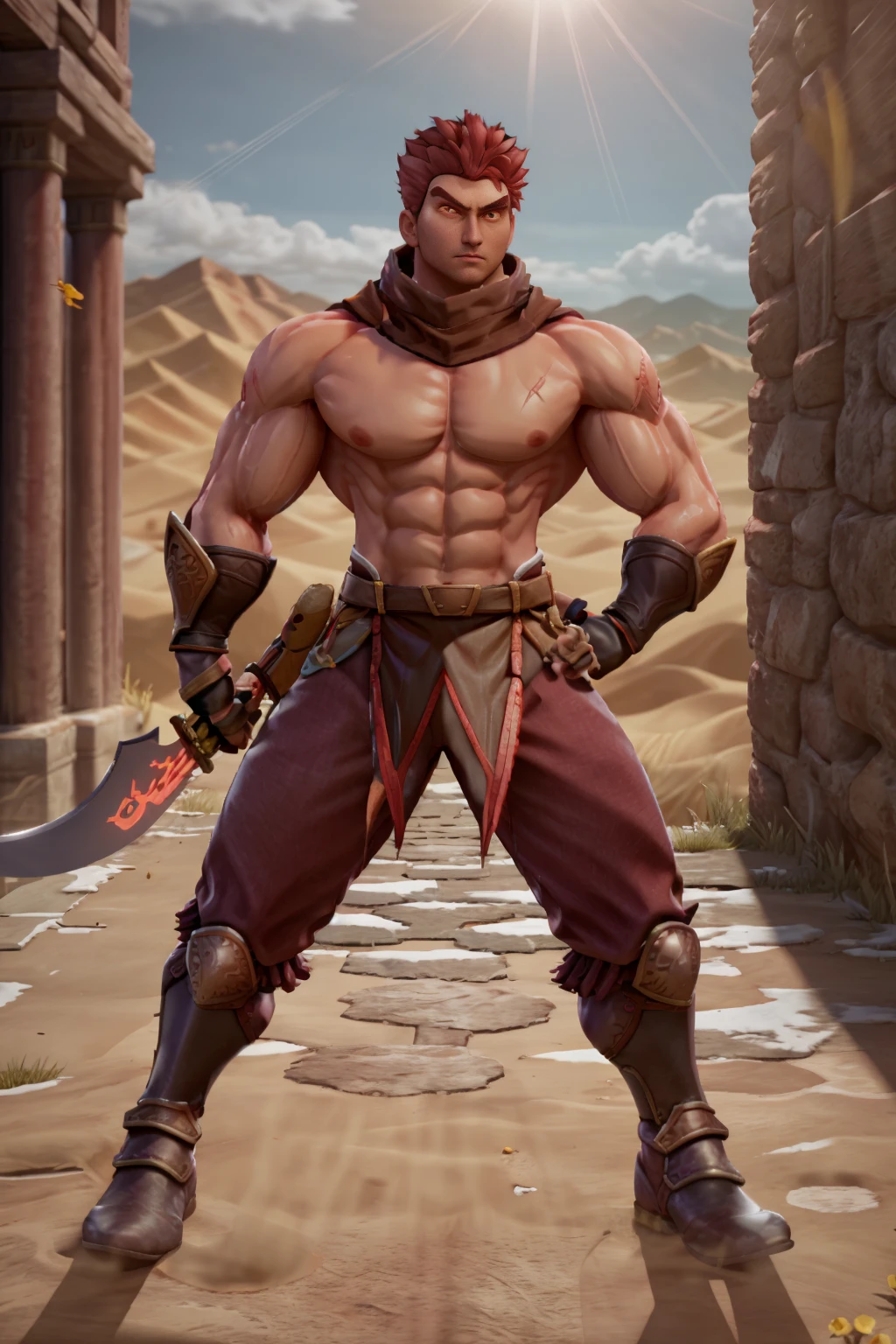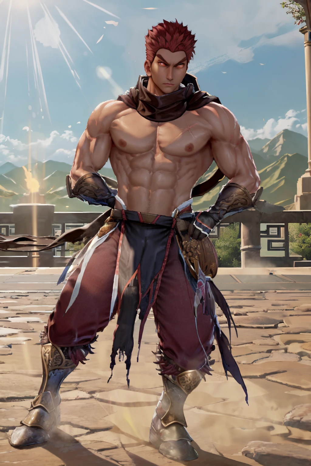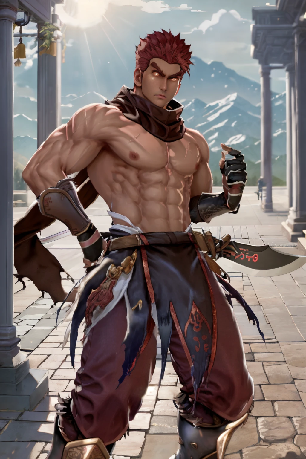 1guy, DHWANG, dark skin, red hair, red eyes, yellow iris, yellow pupils, brown scarf, chest cross scar, topless male, armored wristbands, brown gloves, brown loincloth, red korean pants, belt, sword, chinese sword, armored boots,
