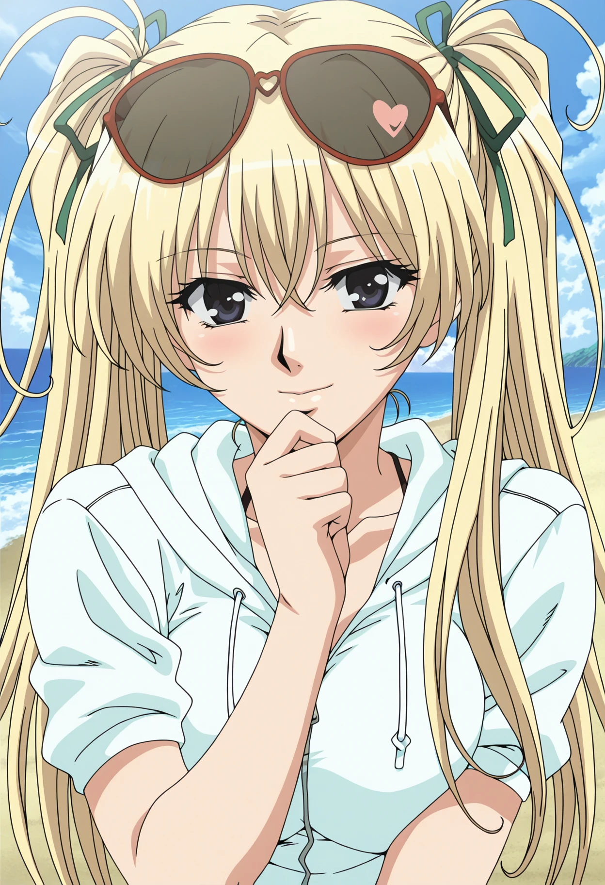 Base: kirishima_u, 1girl, anime coloring, retro artstyle, solo, kirishima twintails, very long hair, blonde hair, red hair ribbon, blue eyes, kirishima heart sunglasses, eyewear on head, leopard print ??????, navel, ????? ??????, tanlines, gyaru,