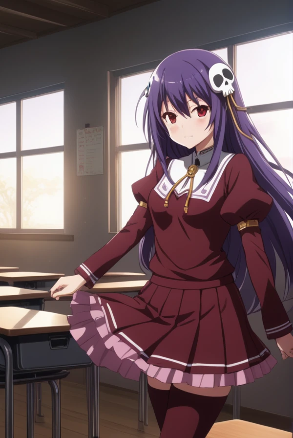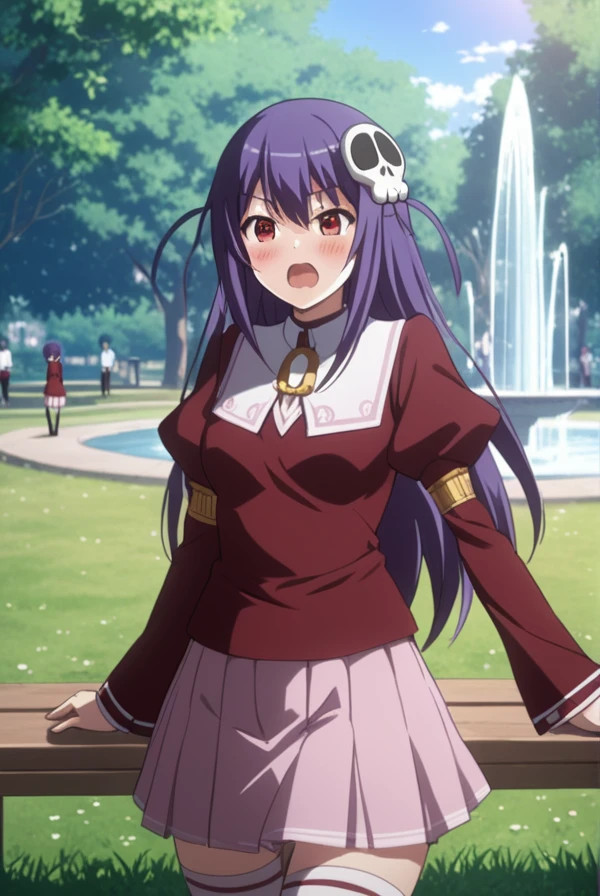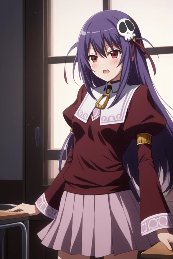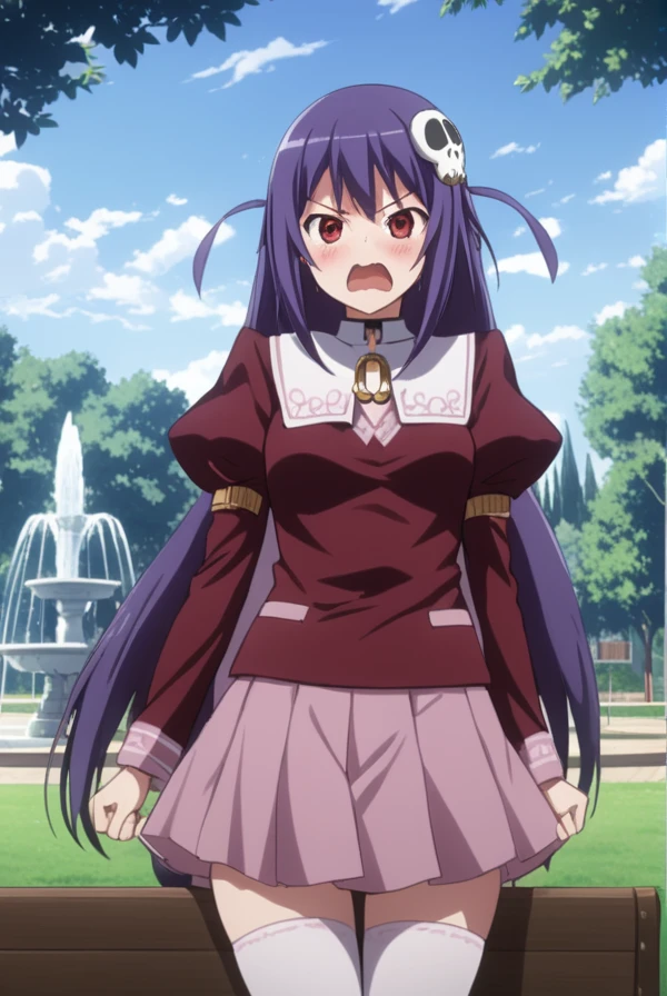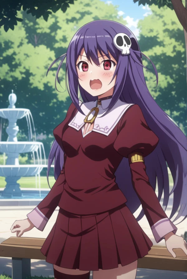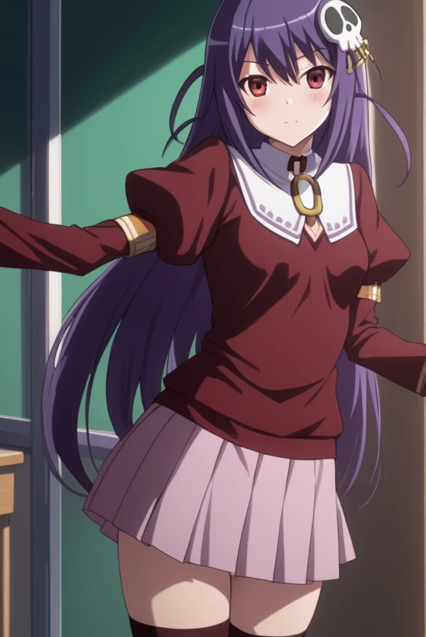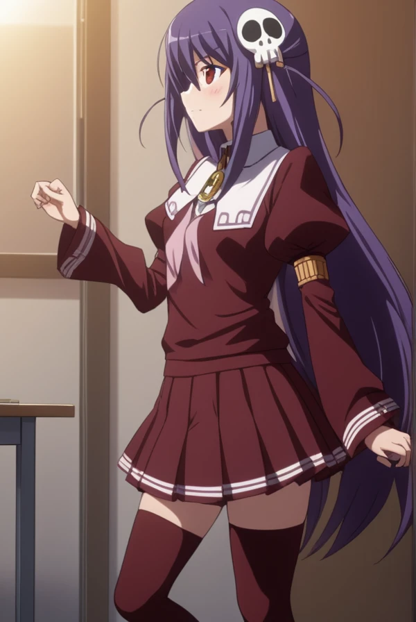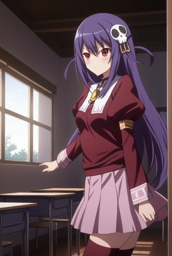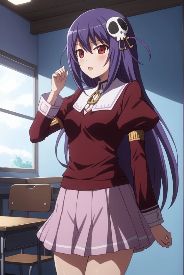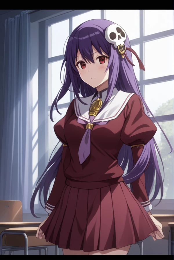 haqua du lot herminium, long hair, hair ornament, purple hair, skull hair ornament, red eyes,
