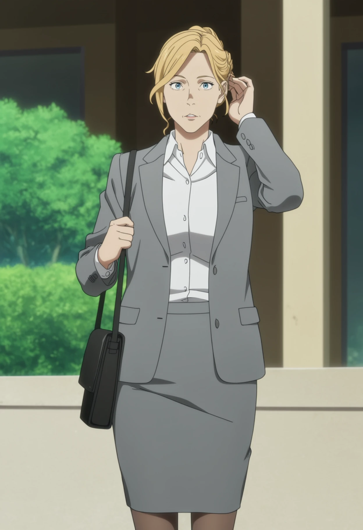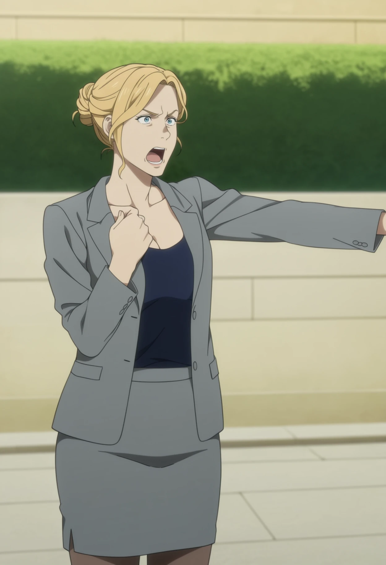 formal,grey jacket,cleavage,blue shirt,grey skirt,pantyhose