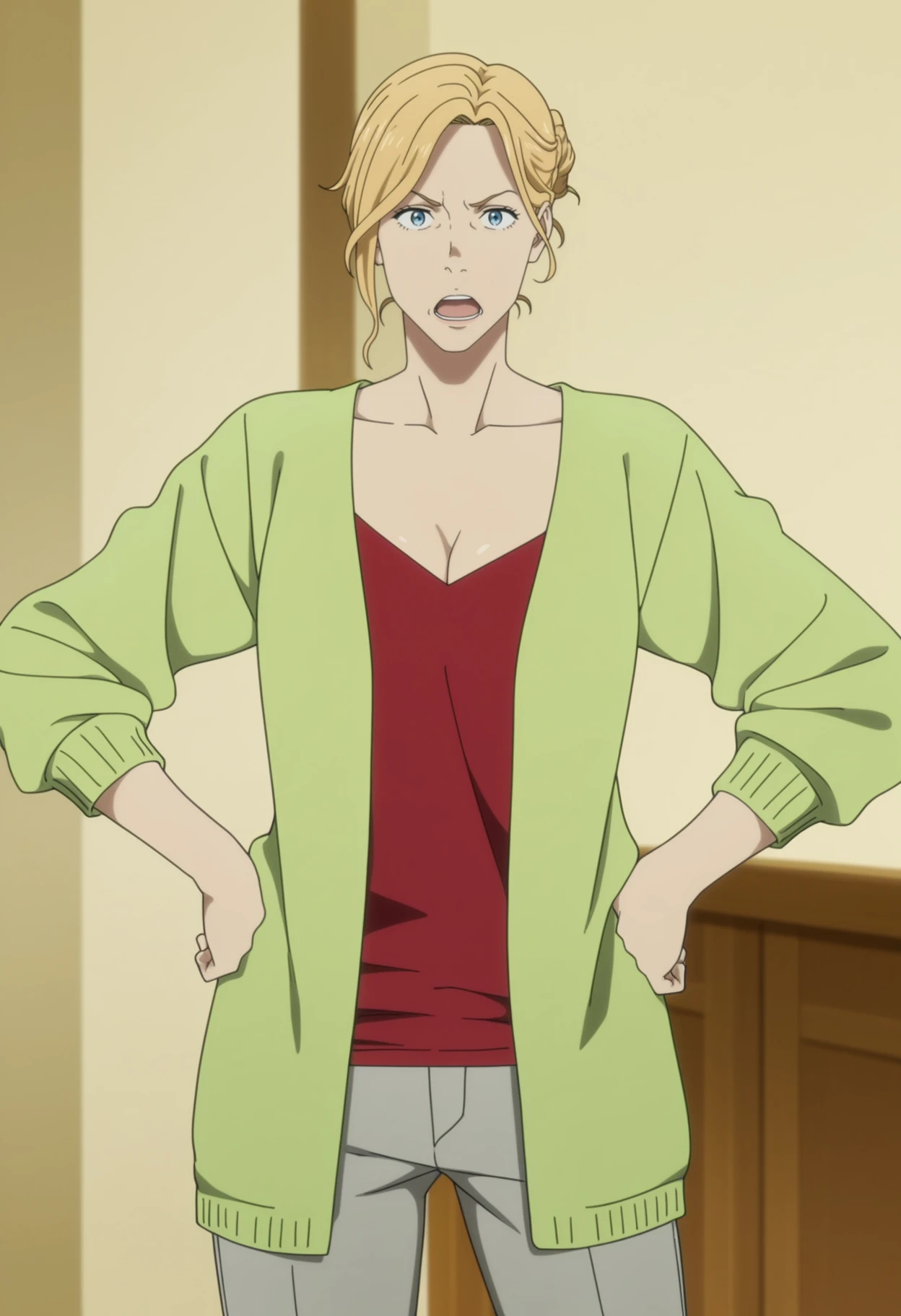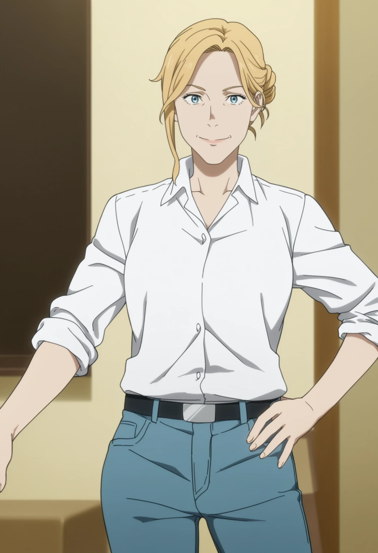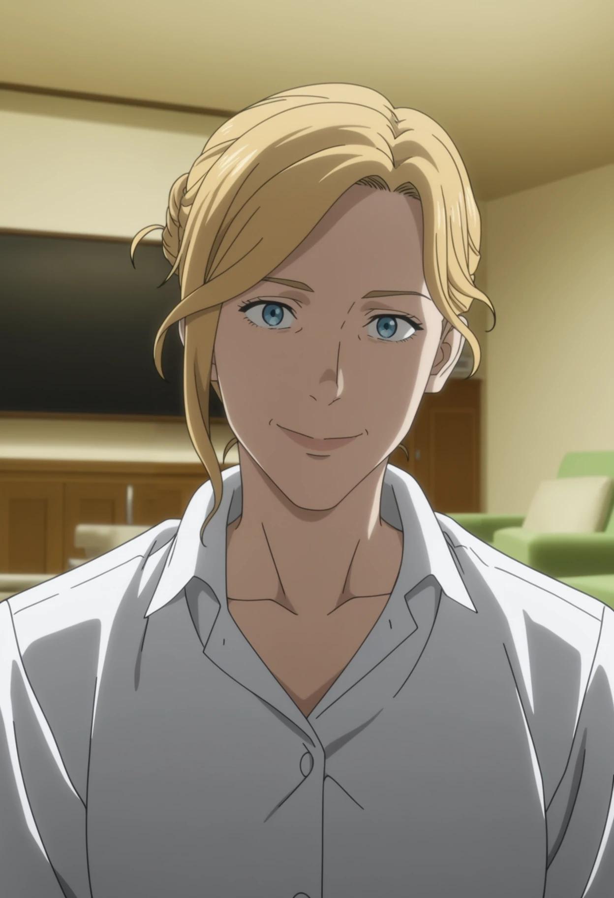 1girl,solo,anime coloring,mm,blonde hair,blue eyes,single hair bun,hair bun
