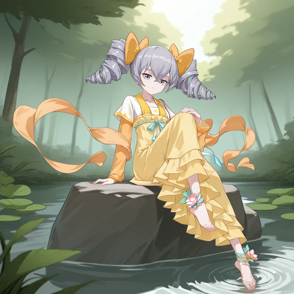 StigPack01, Stg_Brn, bronya zaychik, grey hair, twin drills, drill hair, grey eyes, medium hair, qixiong ruqun, orange bow, hair bow, hagoromo, orange shawl, shawl, short over long sleeves, orange sleeves, collarbone, neck pouch, yellow hanfu, yellow dress, frilled dress, chest ribbon, aqua ribbon, long ribbon, hezi, blouse, white blouse, two-sided skirt, skirt, frilled skirt, ankle ribbon, ankle flower, barefoot, feet,Rita Rossweisse: (Songkran)