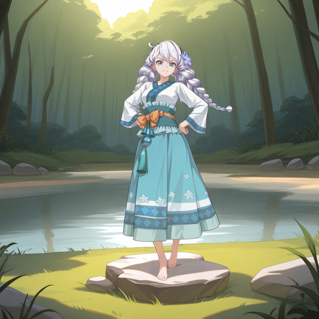 StigPack01, Stg_Kia, kiana kaslana, twin braids, blue eyes, long hair, white hair, ahoge, chinese clothes, white shirt, flower hair ornament, shirt, v-neck, long sleeves, white sleeves, blue trim, wide sleeves, tassel, argyle clothes, light blue sash, waist bow, orange bow, frilled sash, light blue skirt, medium skirt, purple flower, barefoot, feet,Raiden Mei: (Dragon Boat Festival)