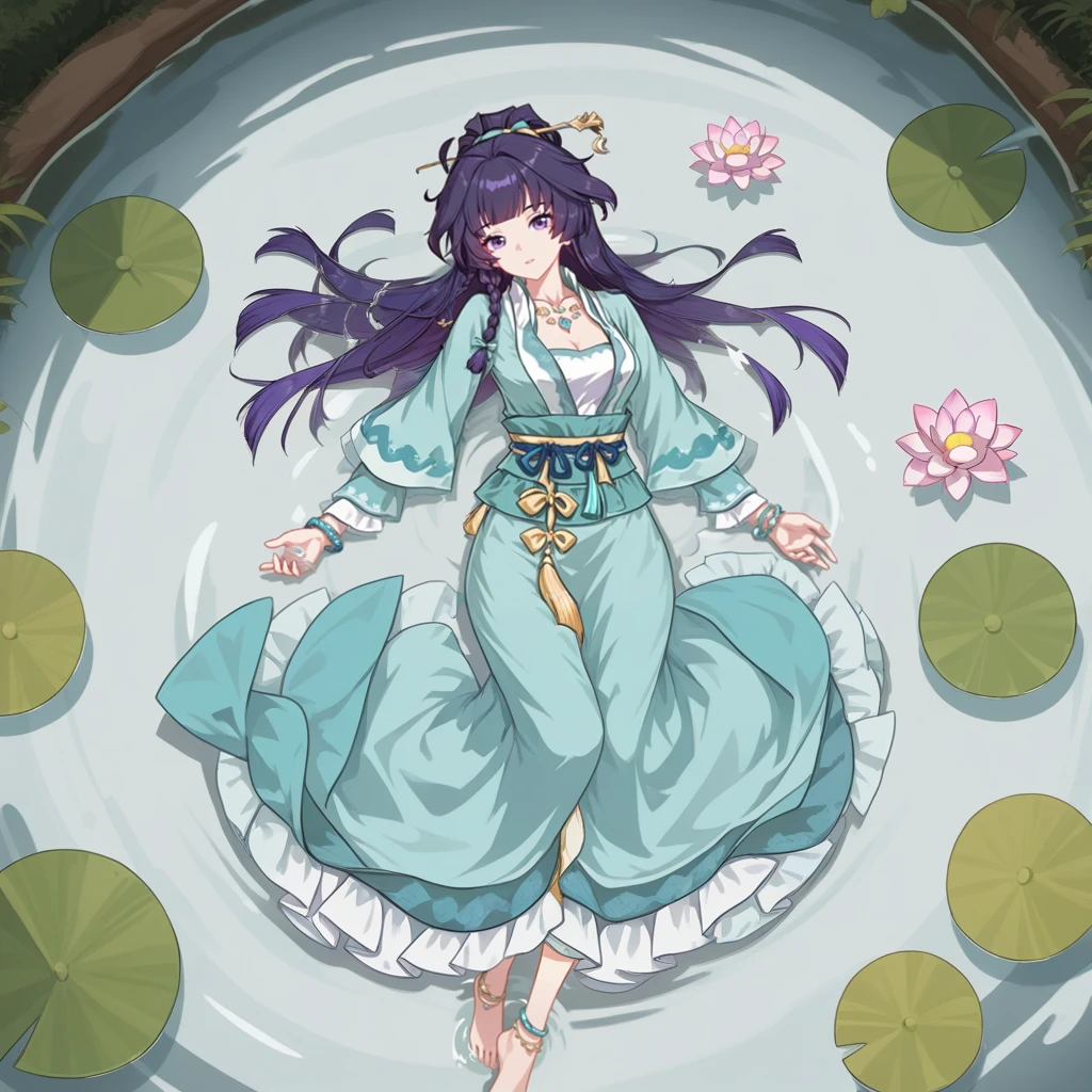 StigPack01, Stg_Mei, raiden mei, purple hair, braid, ponytail, long hair, purple eyes, hair stick, necklace, blue gemstone, jewelry, bracelet, aqua hanfu, hanfu, aqua sleeves, layered sleeves, white bandeau, bandeau, strapless shirt, duijin ruqun, aqua sash, aqua dress, long dress, frilled dress, blue rope, blue ribbon, rope around waist, yellow ribbon, waist ribbon, yellow tassel, cleavage, anklet, barefoot, feet,Bronya Zaychik: (Dragon Boat Festival)