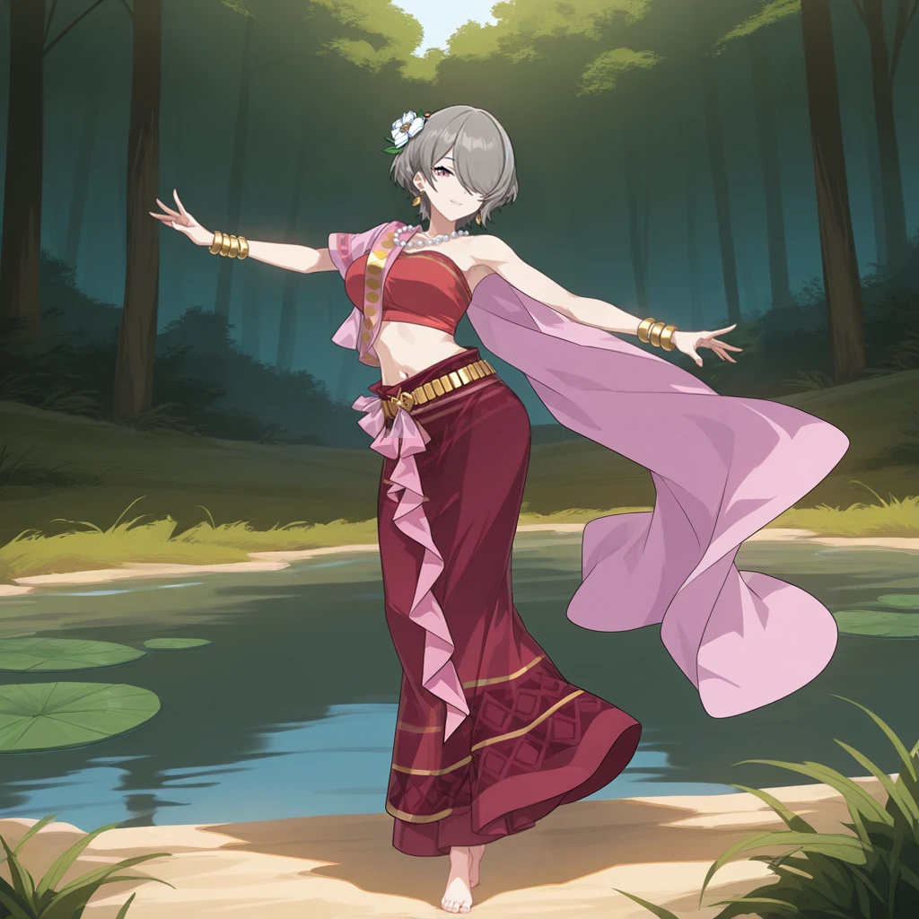 StigPack01, Stg_Rta, rita rossweisse, hair over one eye, pink eyes, brown hair, short hair, earrings, arabian clothes, pink sash, shoulder sash, cape, pink cape, two-sided cape, pearl necklace, white flower, hair flower, red tube top, tube top, midriff, navel, single bare shoulder, multiple bracelets, gold bracelet, red skirt, long skirt, tied skirt, gold trim, striped skirt, gold belt, print skirt, barefoot, feet,Yae Sakura: (Furisode)