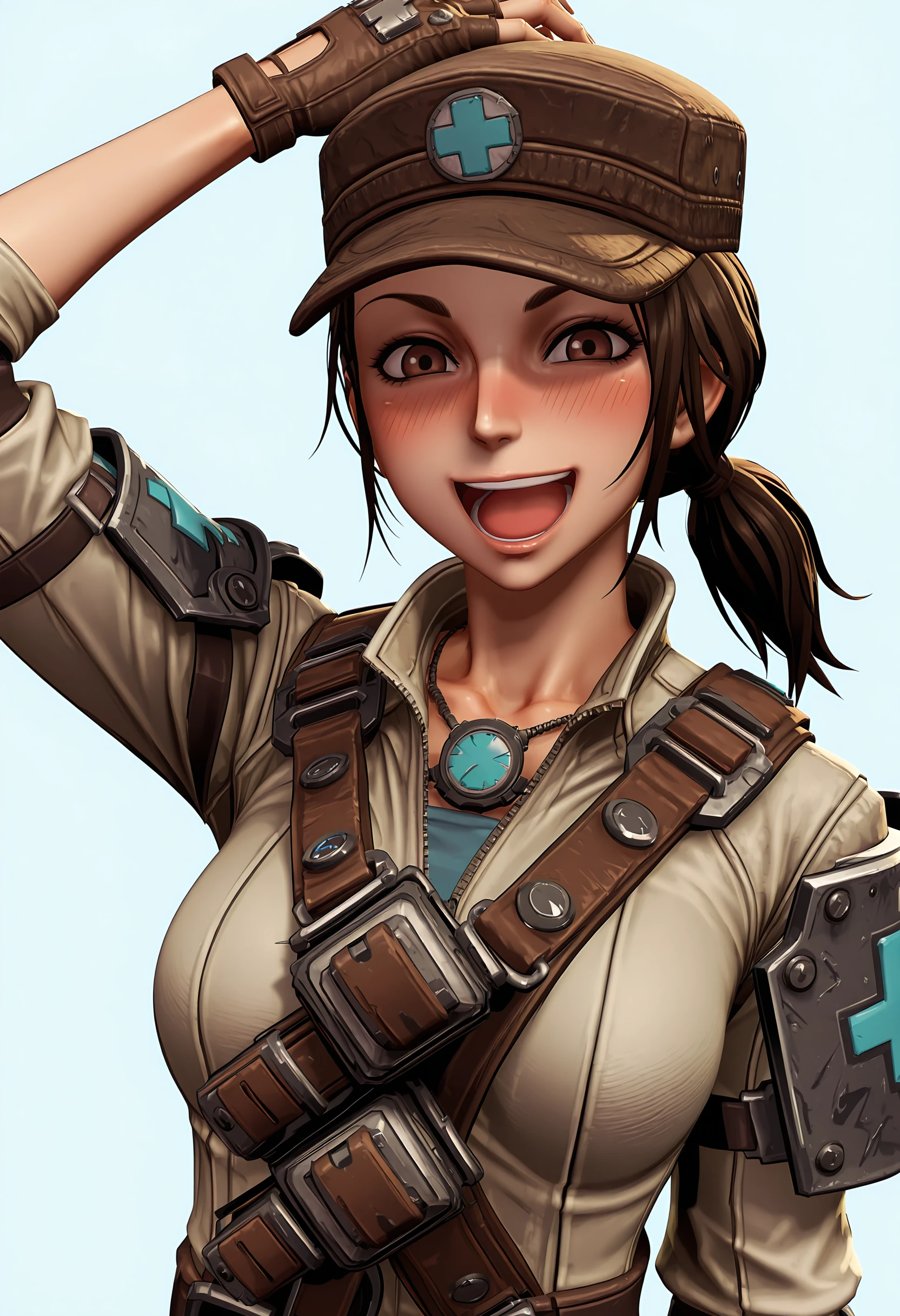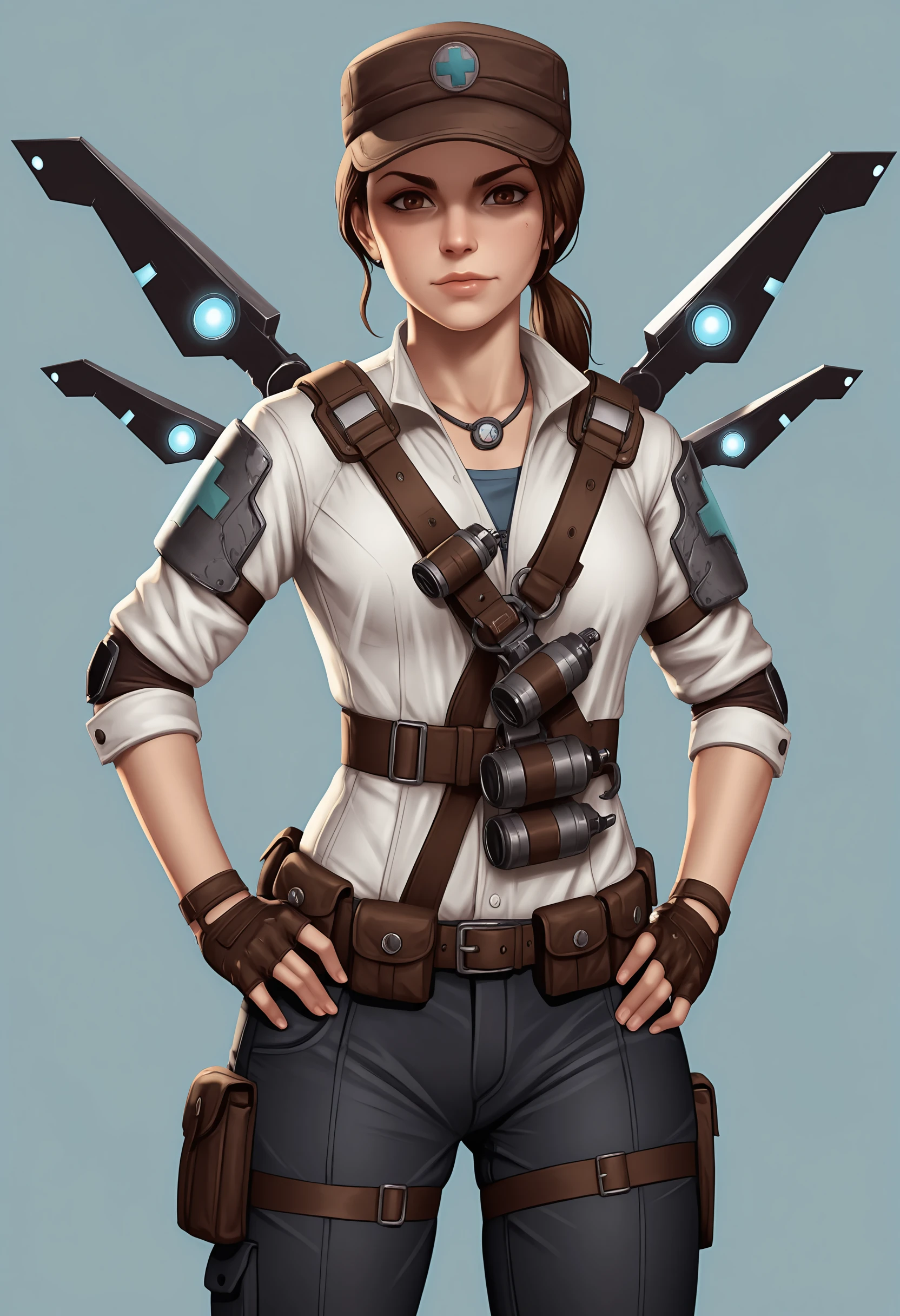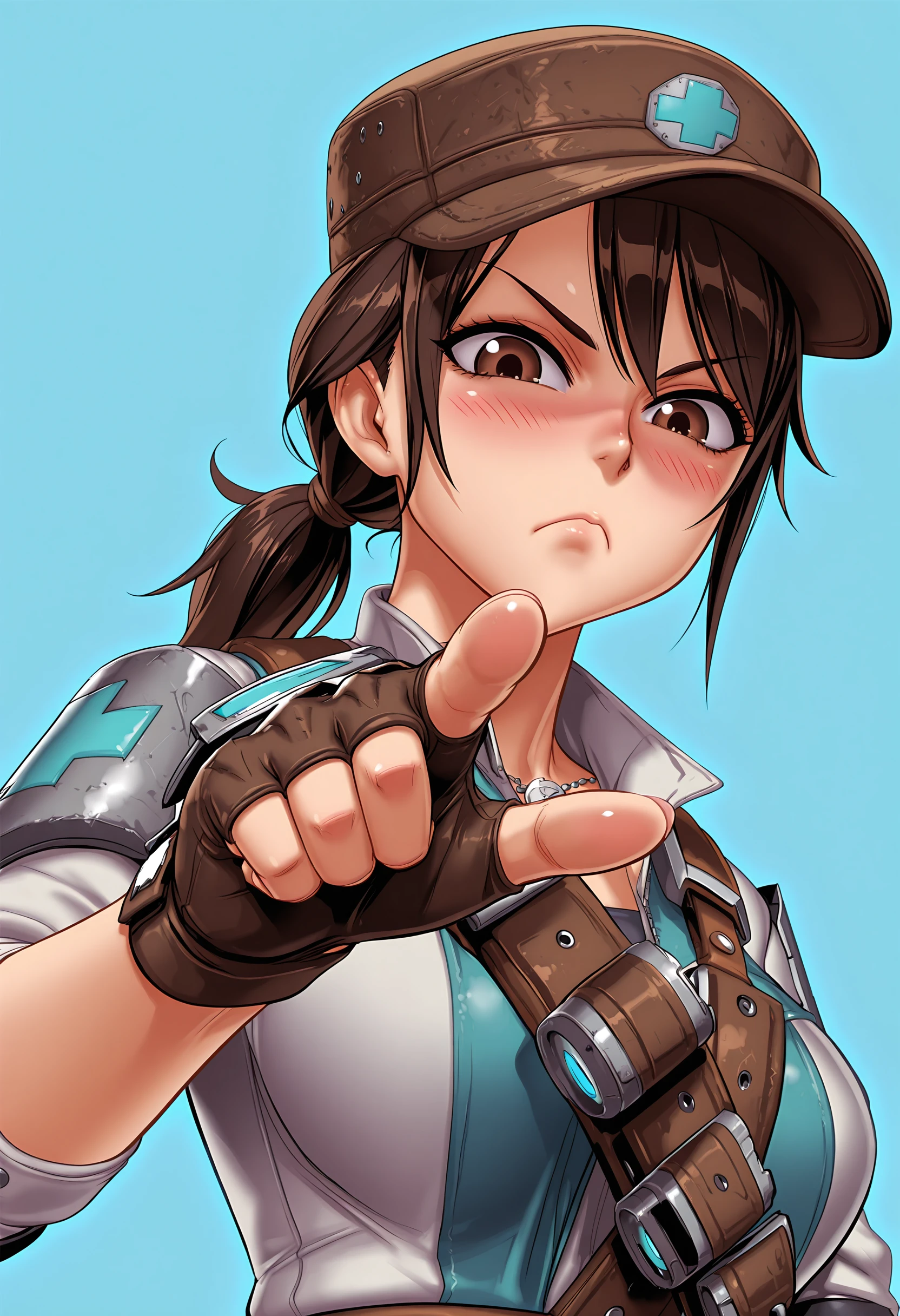 brown hair, brown eyes, hat, jacket, pants, fingerless gloves