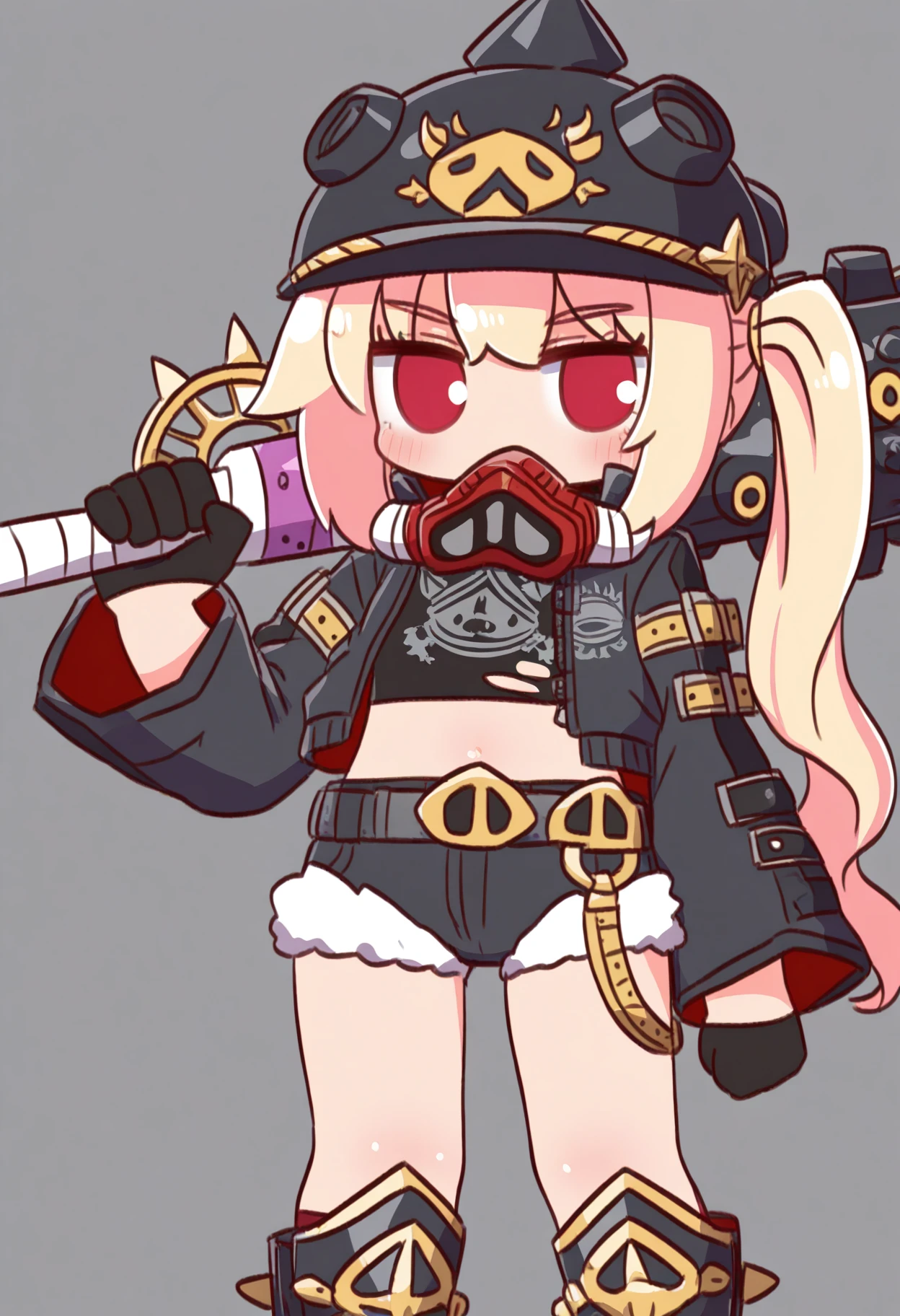 spiked club, weapon over shoulder,Her outfit is very modular, you can change the short shorts to micro shorts as well.