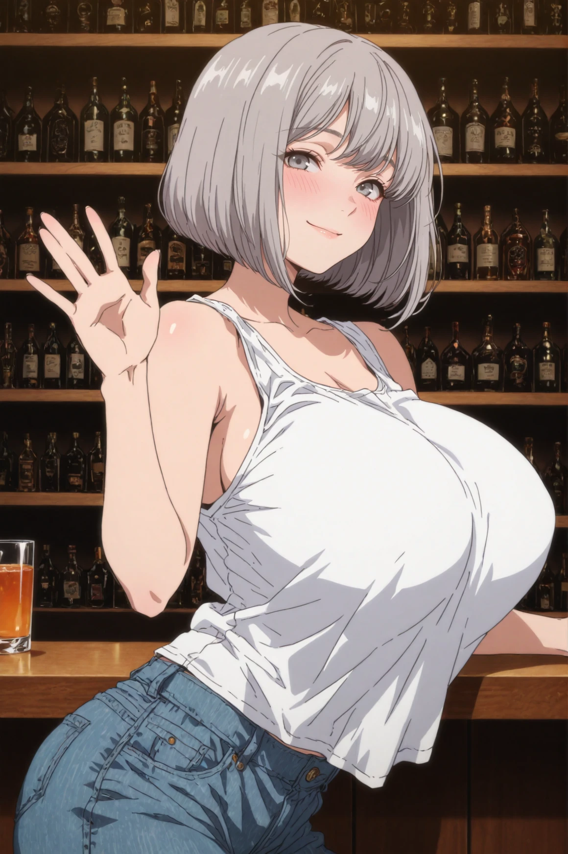 ,aina_yoru_thd,silver hair,bob cut,side fringe,grey eyes,huge breasts