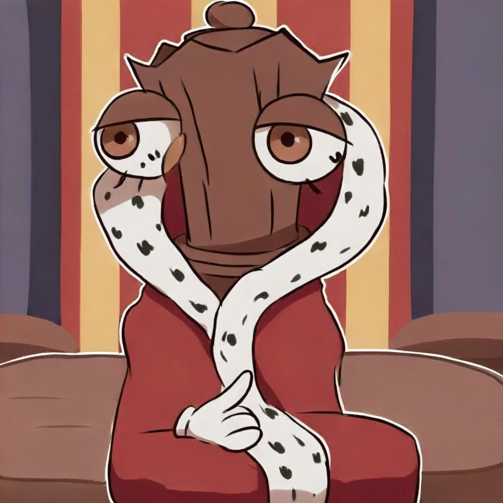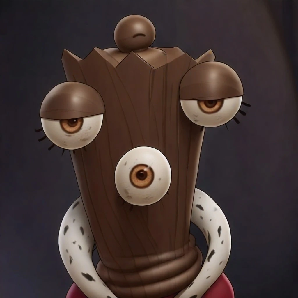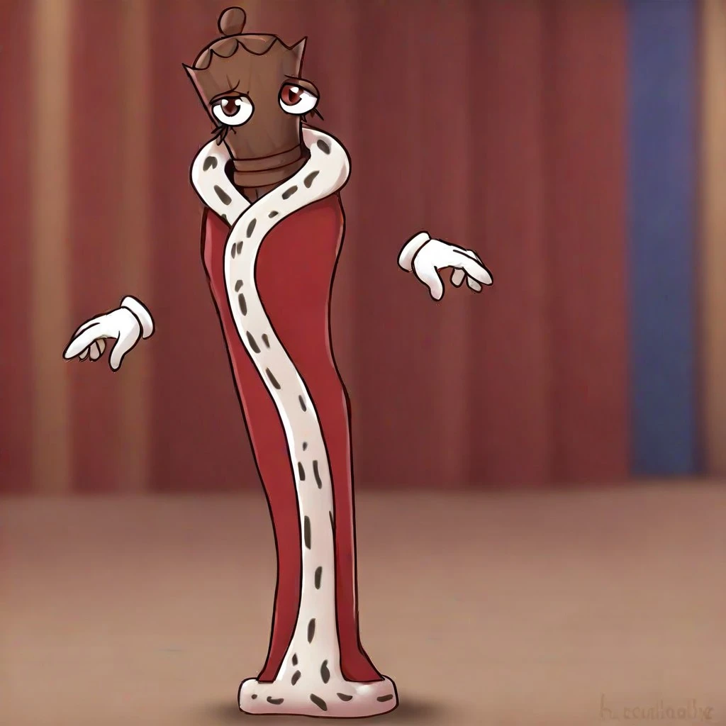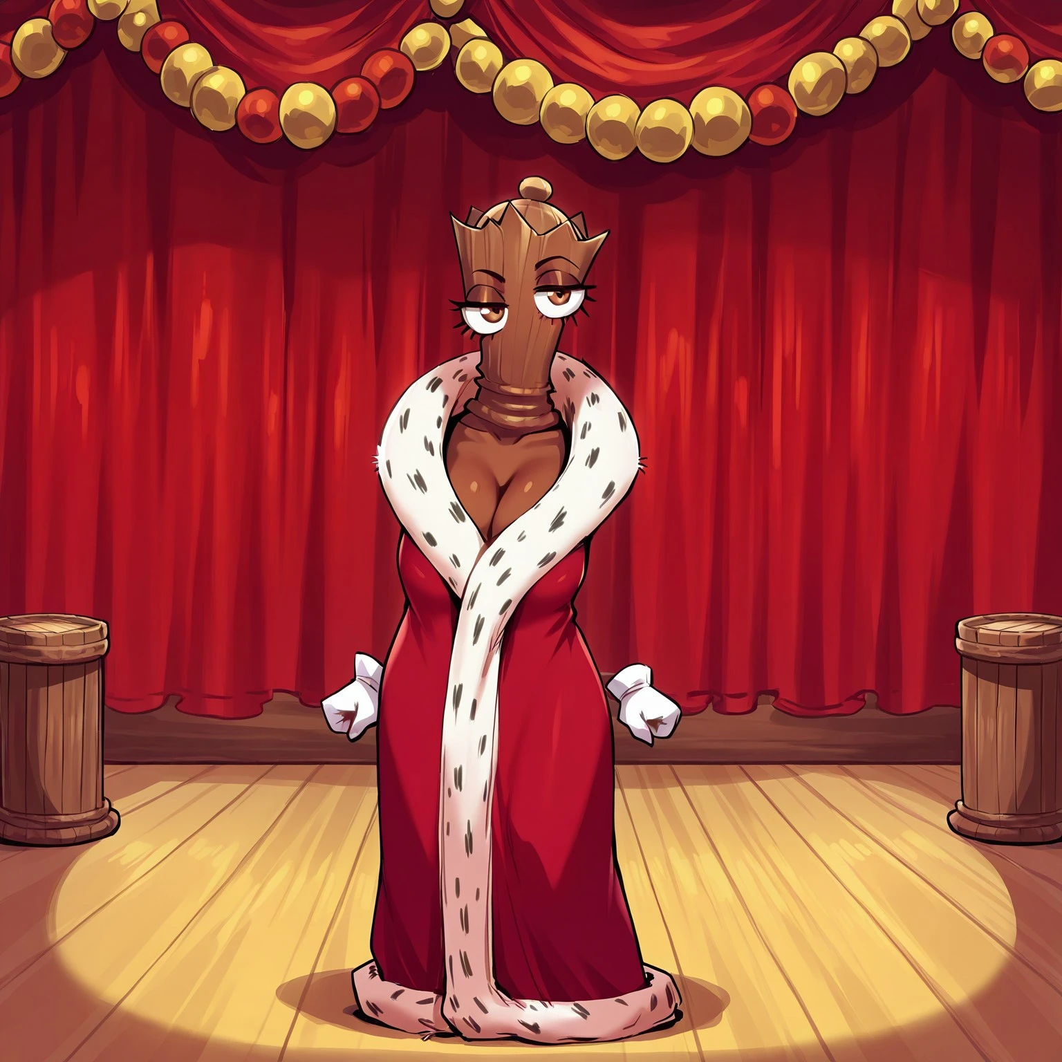 Queenie(character), female, brown body, wooden body, ditched hands, no mouth, red robe,