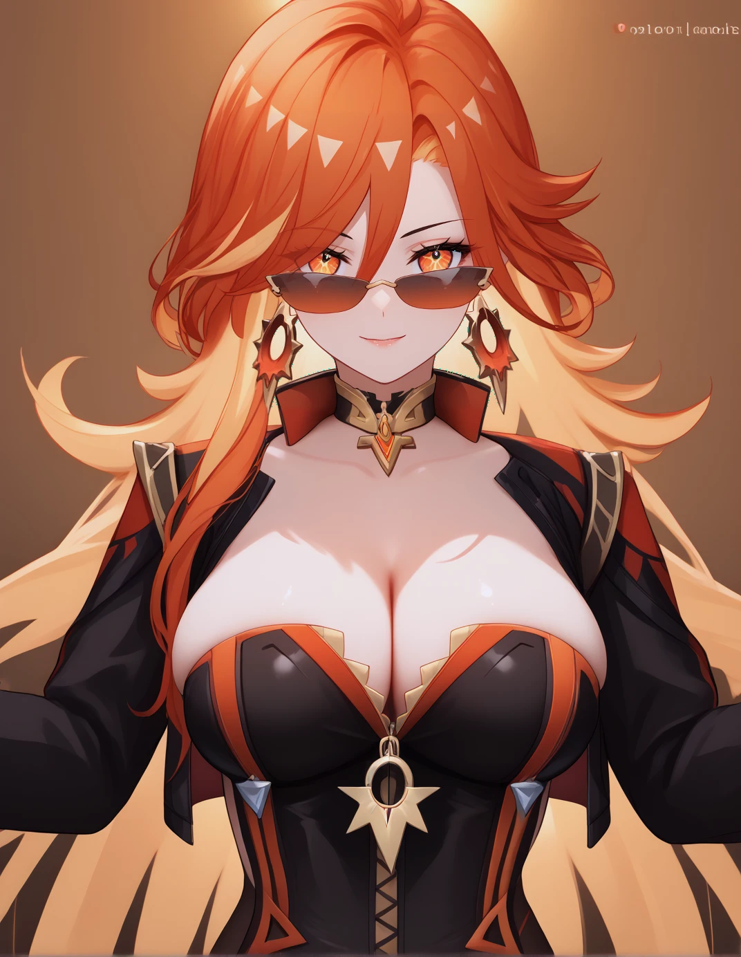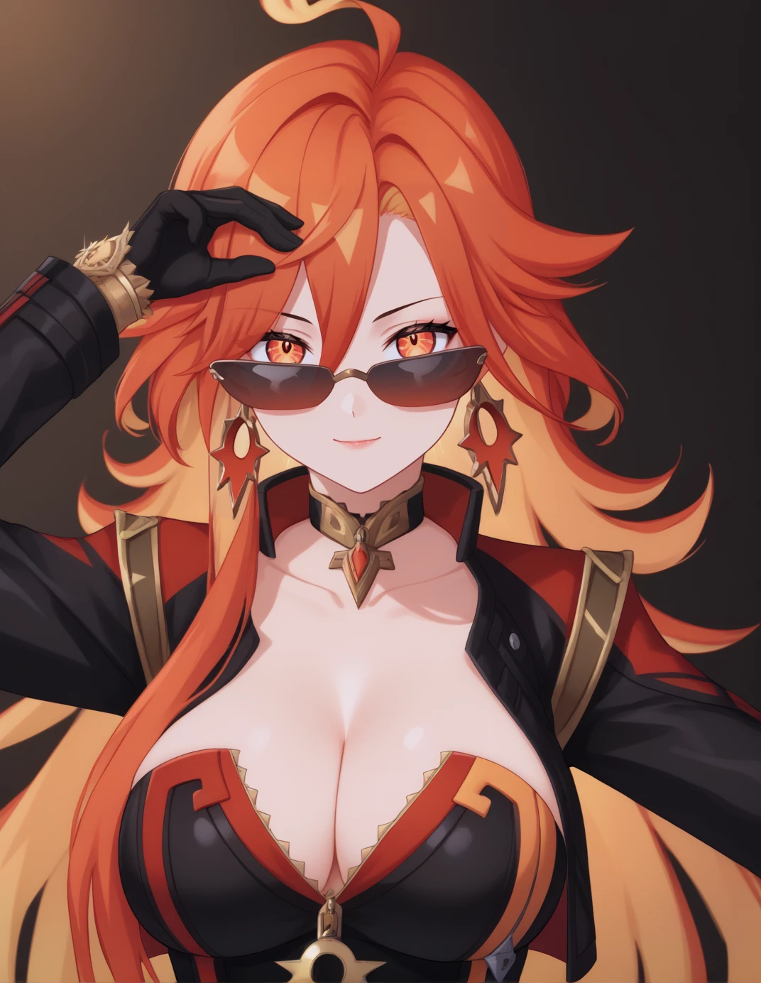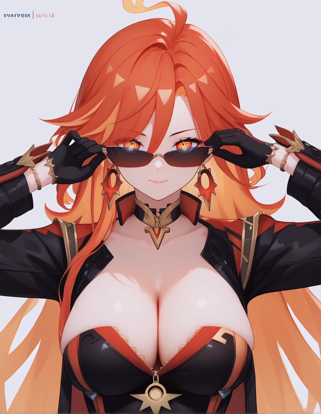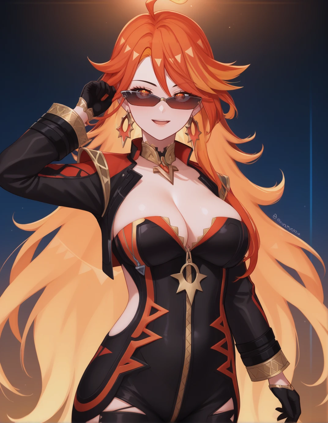 mavuika,earrings,multicolored hair,ahoge, orange hair,large breasts,two-tone hair,