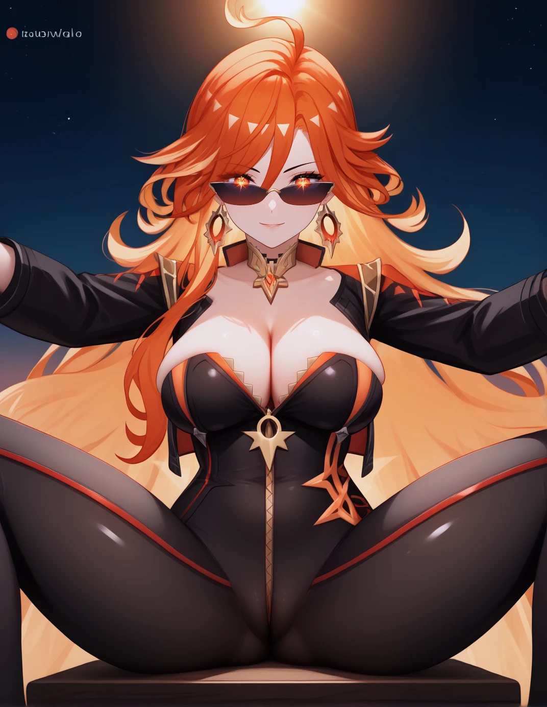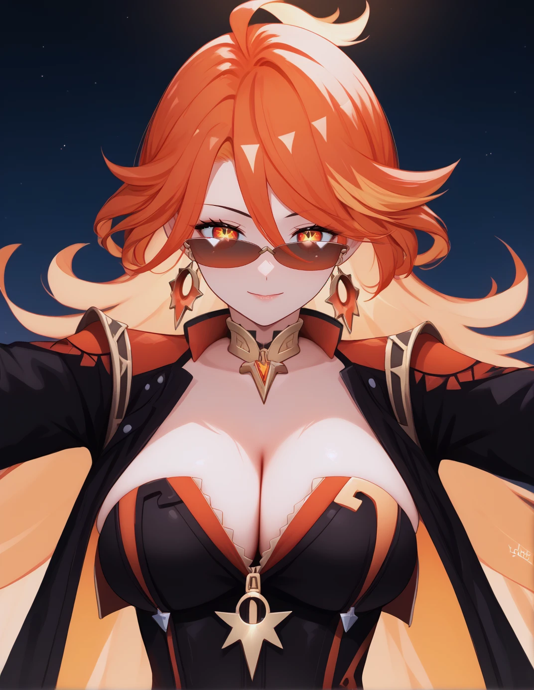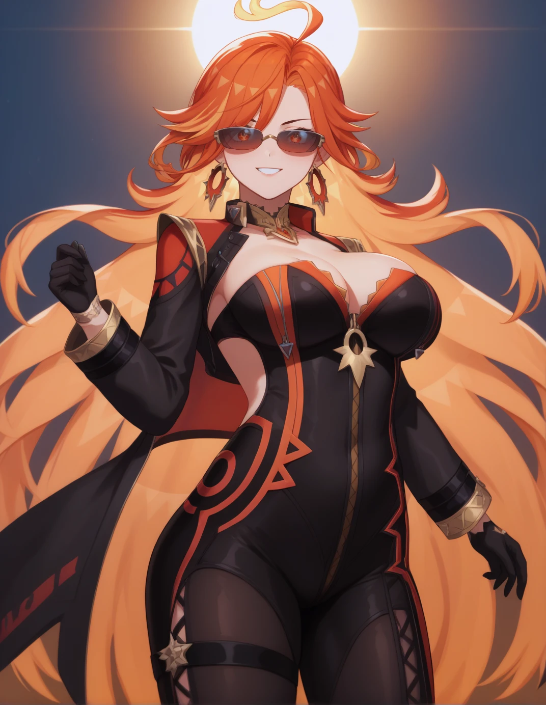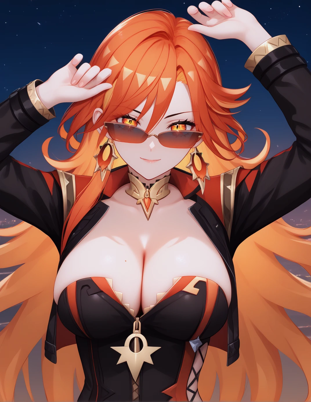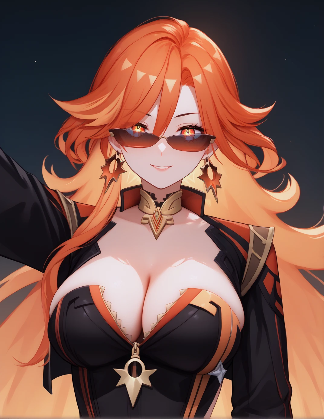 mavuika,earrings,multicolored hair,ahoge, orange hair,large breasts,two-tone hair,