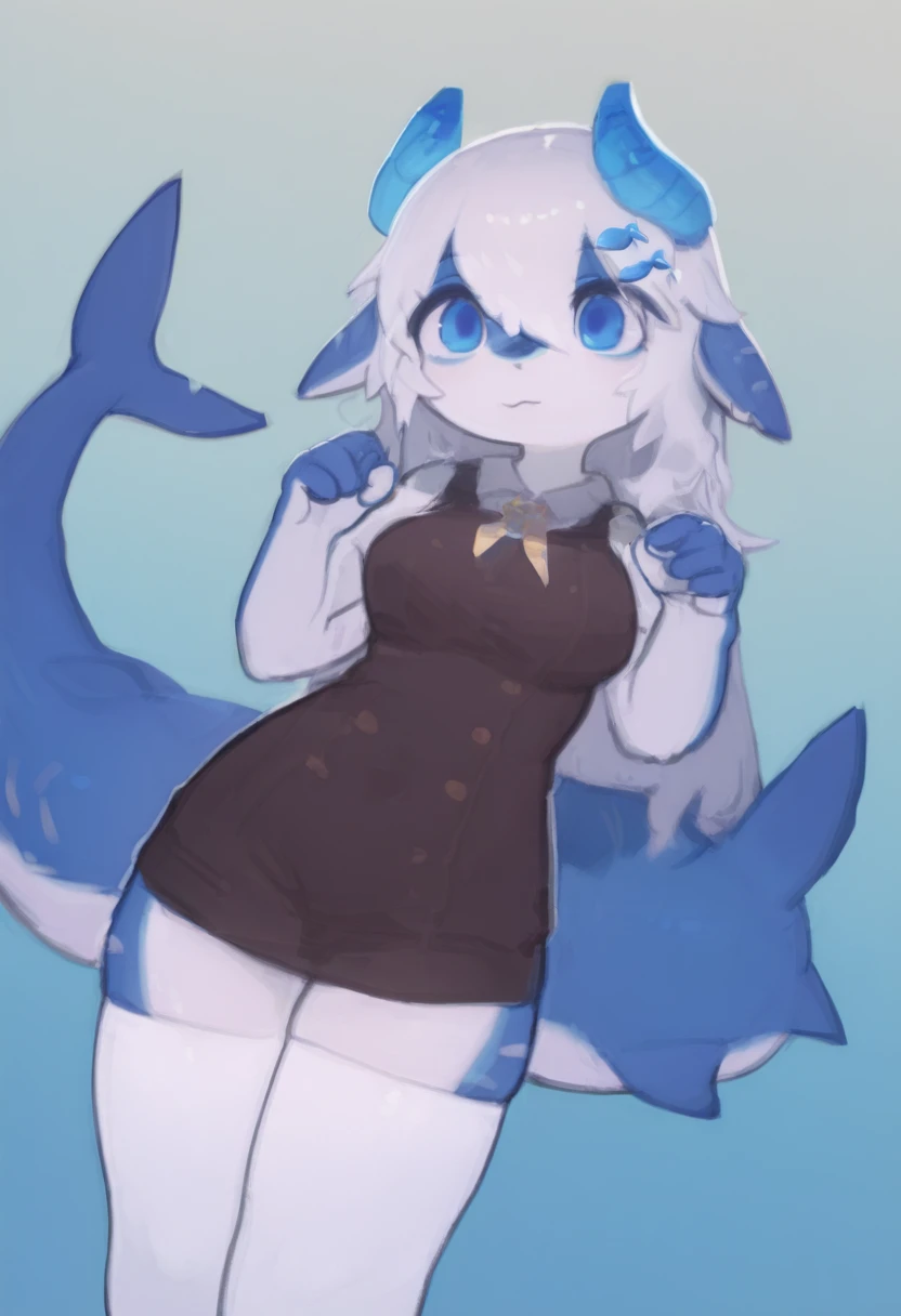 furry female, furry, horns, tail, fish tail, long hair, shark tail, blue eyes, colored skin, blue horns, white skin, white hair, fins, blue skin, shark girl, medium breasts, hair ornament, fish hair ornament, multicolored skin, hair between eyes