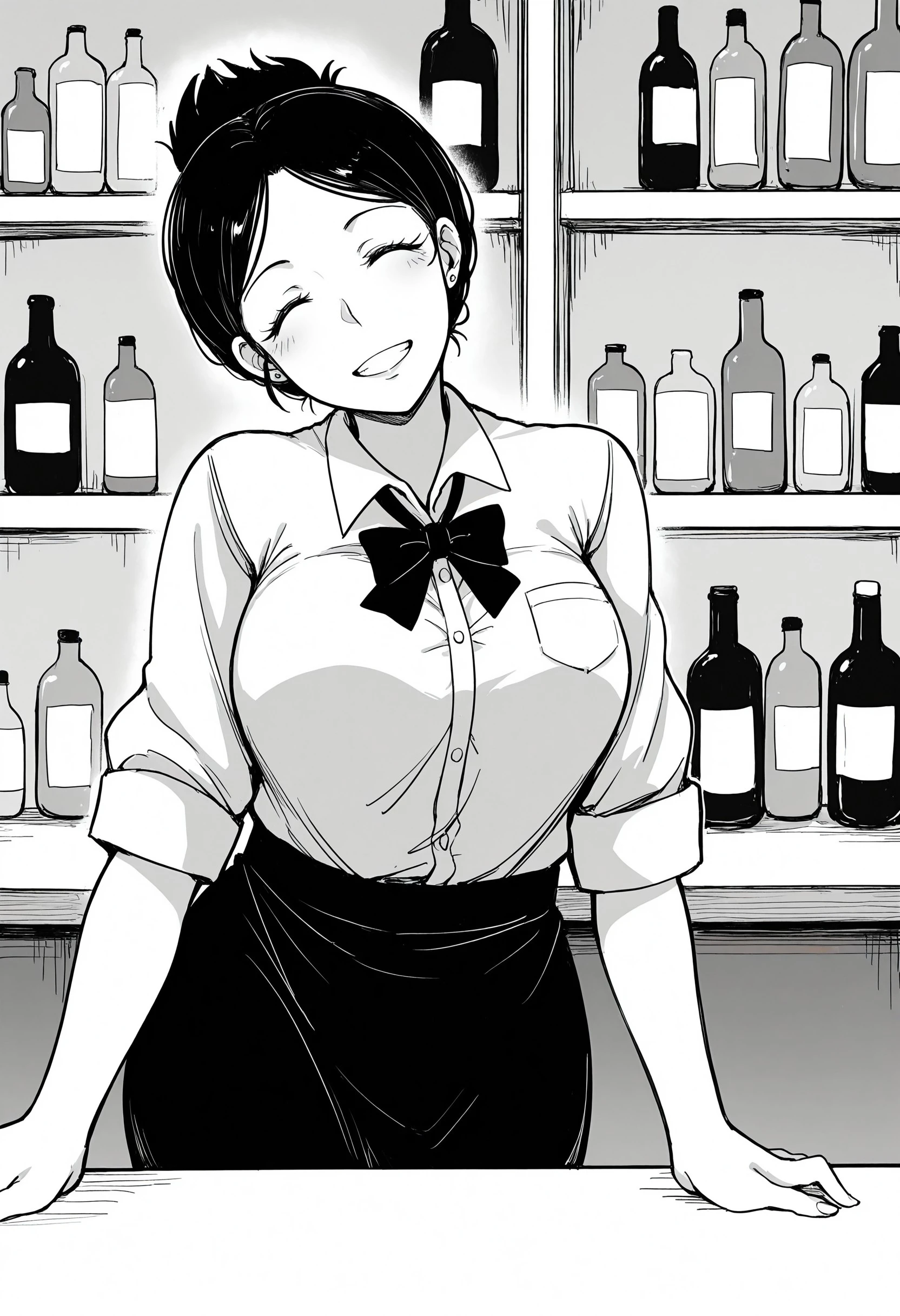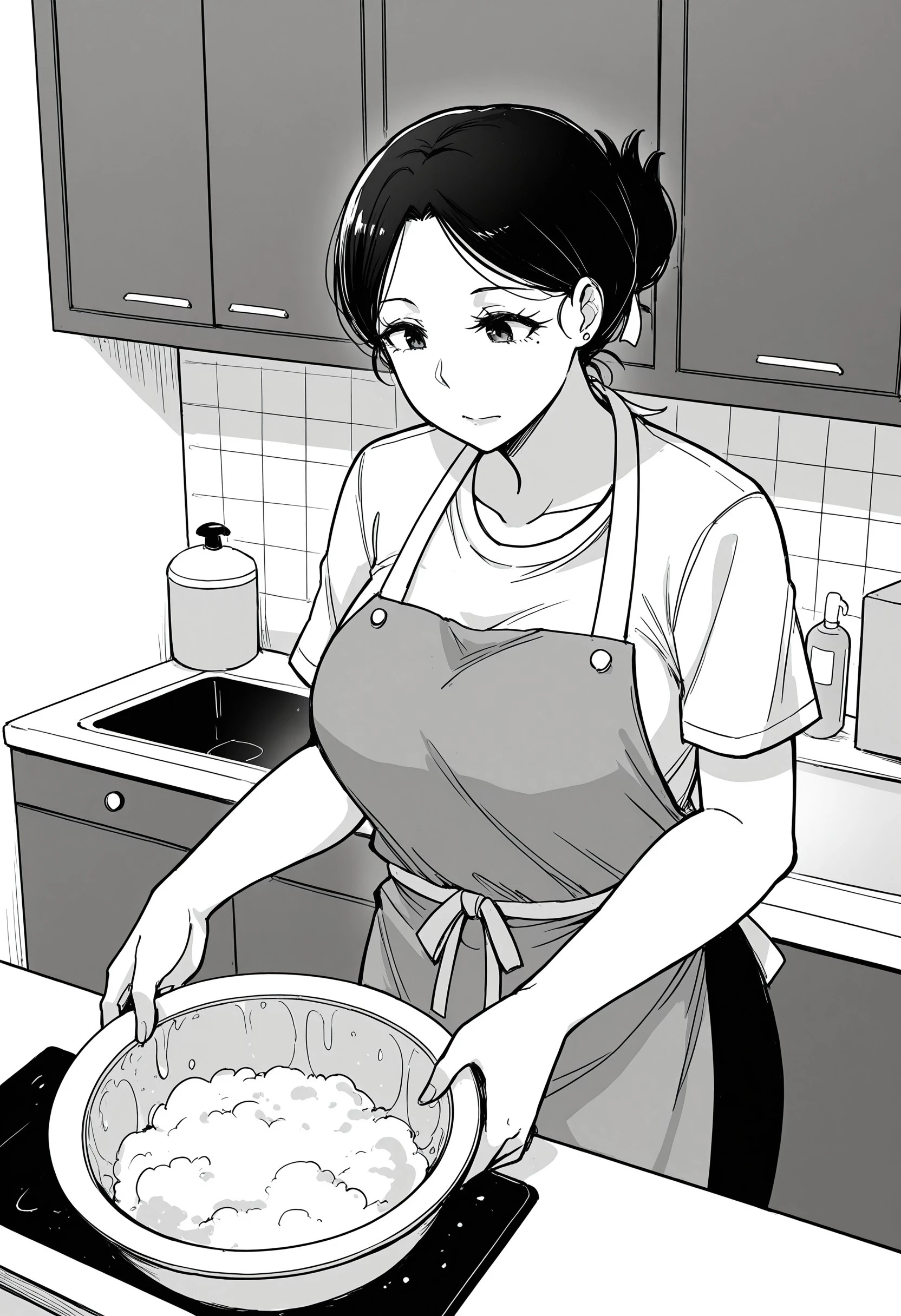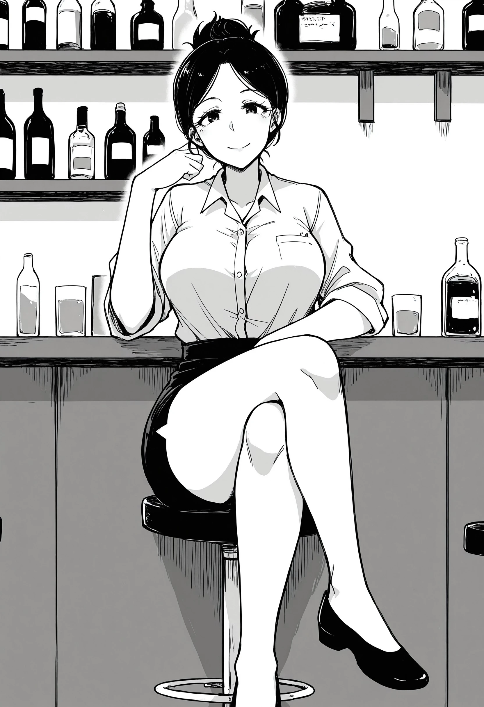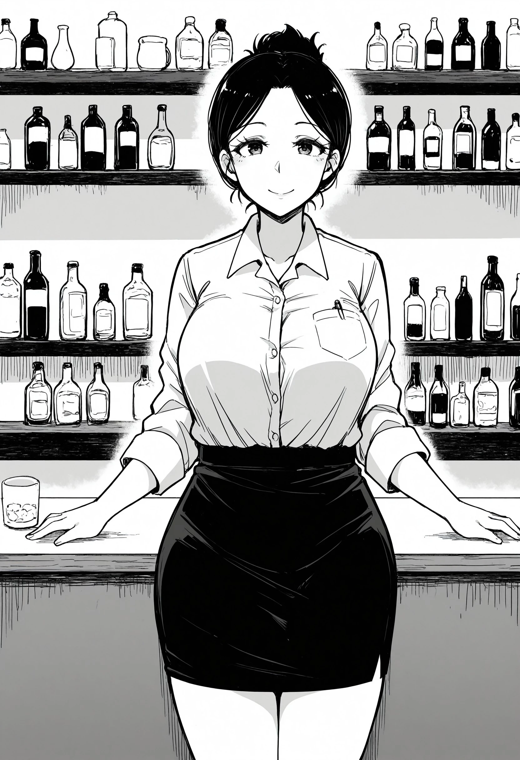 0kus4n, short_hair, hair_bun, mature, thick_eyelashes