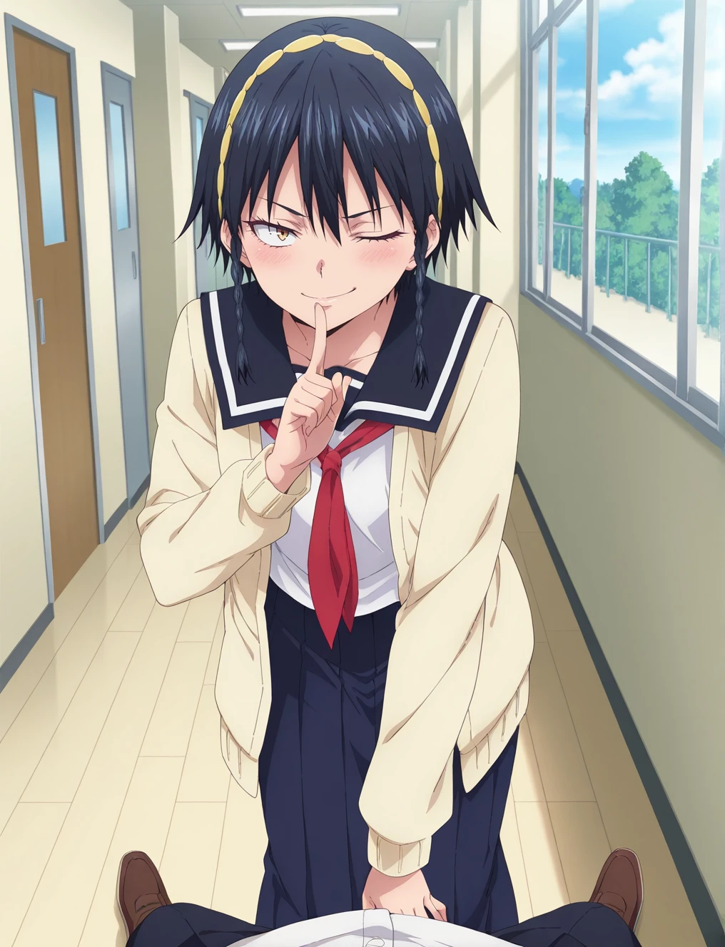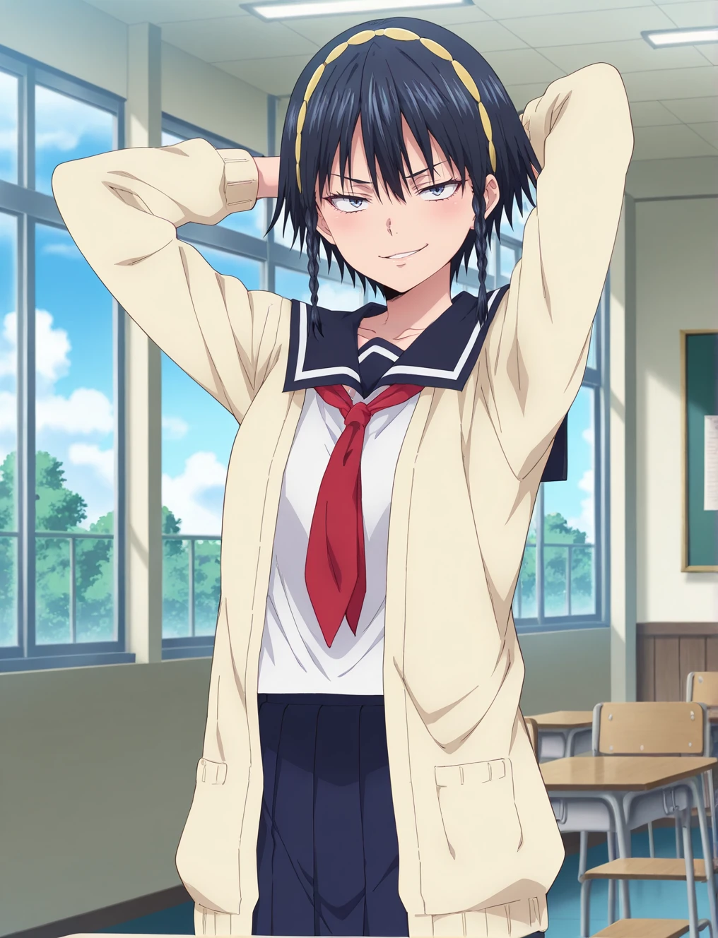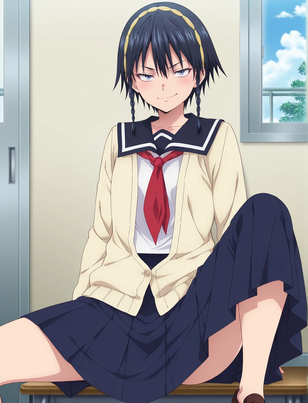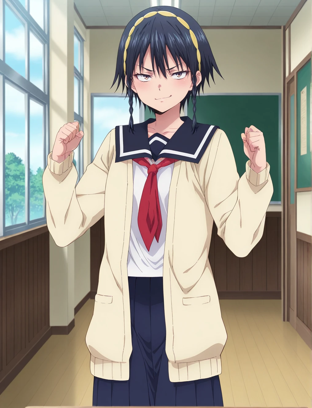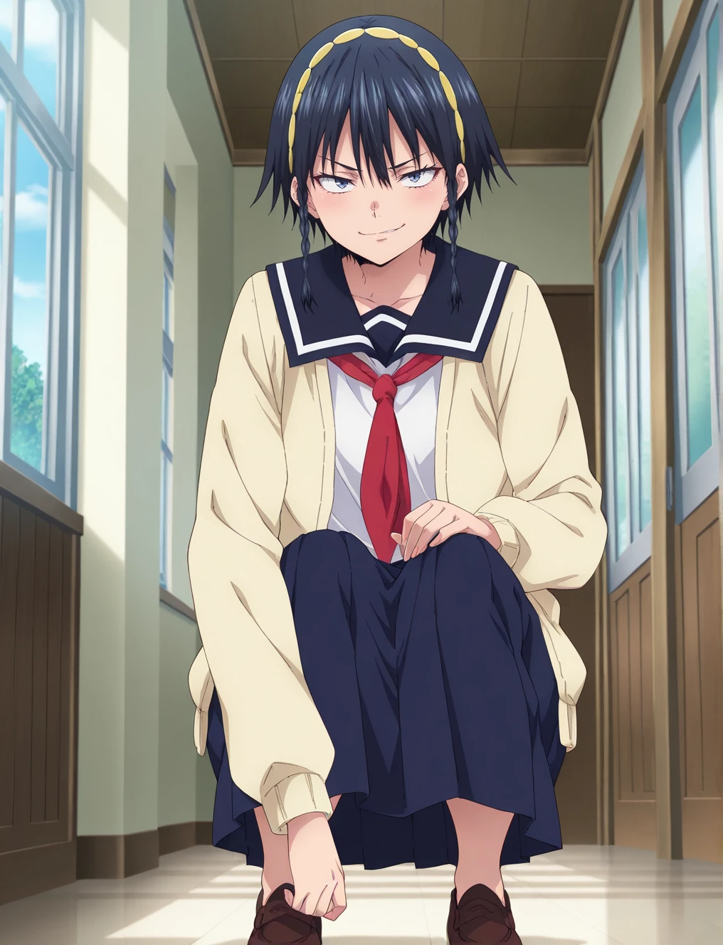 school uniform, school uniform, yellow hairband, serafuku, sanpaku, cardigan, white shirt, black sailor collar, red neckerchief, long skirt, blue skirt, pleated skirt, loafers, brown footwear