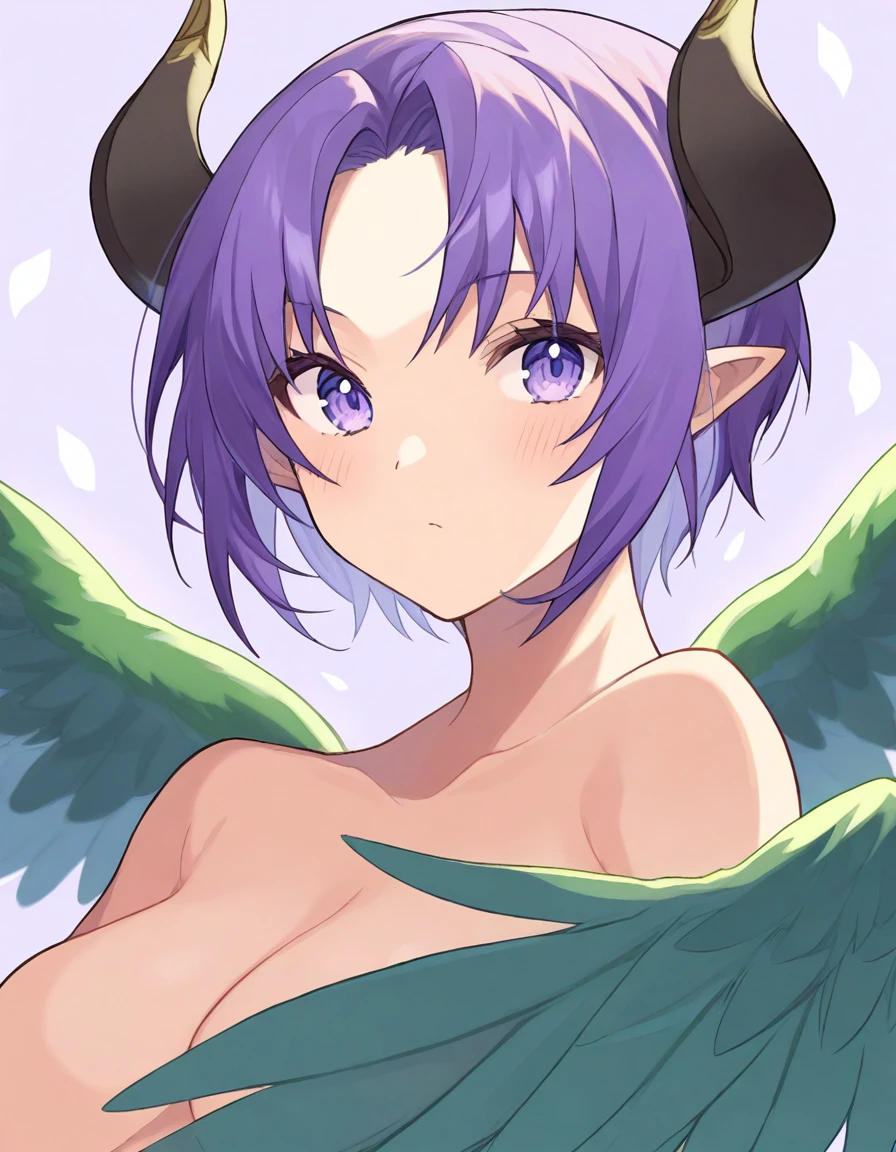 saizelxl, short hair, purple eyes, purple hair, wings, horns, pointy ears