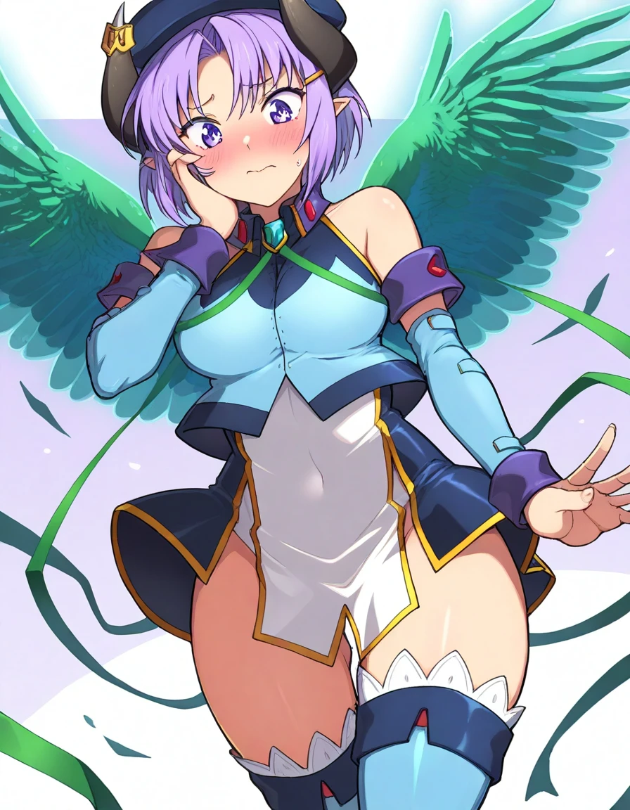 hat, blue jacket, bare shoulders, detached sleeves, dark blue one-piece dress, white pelvic curtain, blue thighhighs
