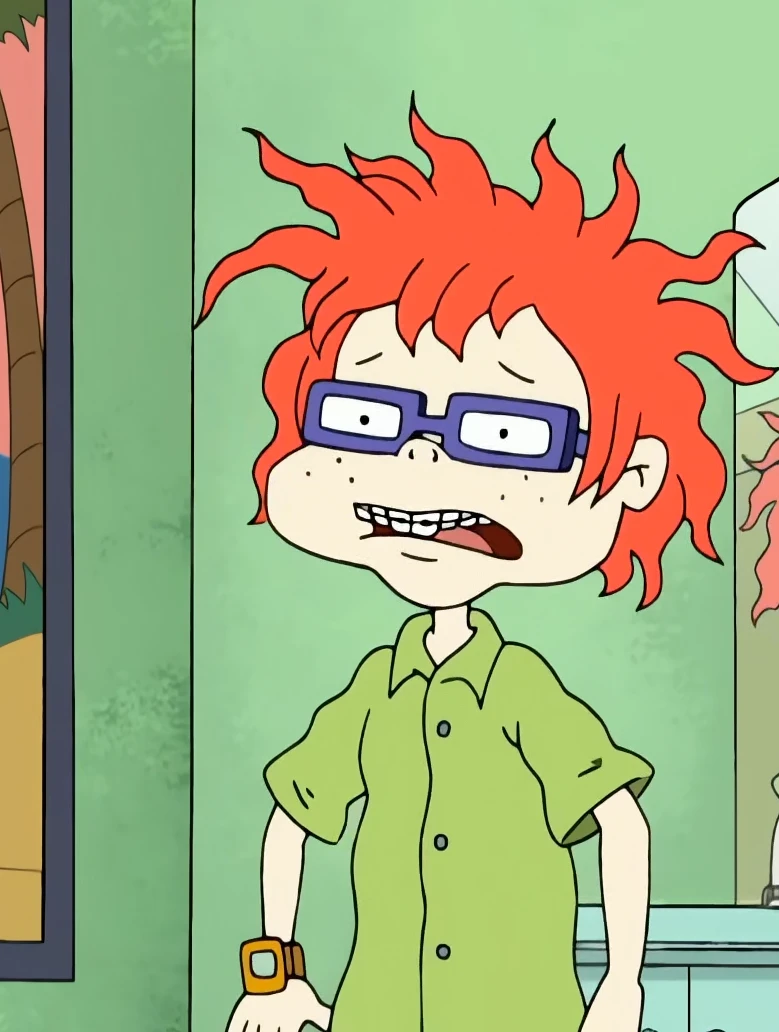 Chuckie, 1boy, Freckles, purple glasses, braces, green shirt, orange pants, brown shoes, 2d animation