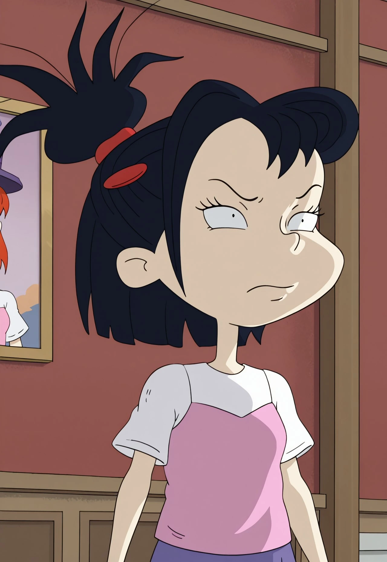 Kimi, 1girl, bound black hair, red hair clip, pink shirt over a white shirt, purple skirt, brown boots, 2d animation
